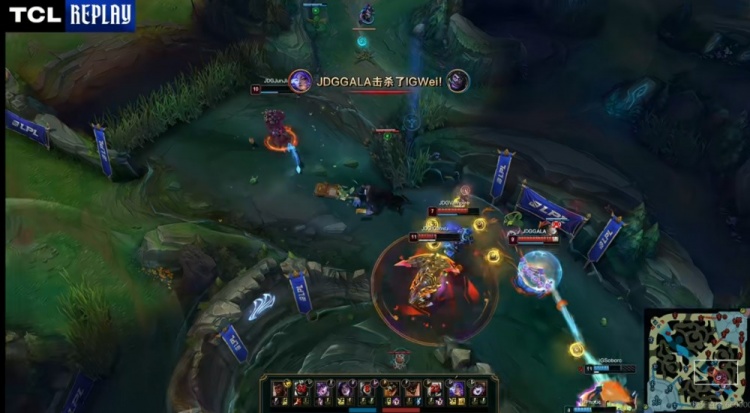 [9:02]下路遭遇战,iG集火强杀Junjia墨菲特未果被璐璐+自己双大招逃出!GALA芸阿娜切死Jwei妮蔻,但是Rookie辛德拉支援赶到,换掉了GALA芸阿娜!双方1换1!