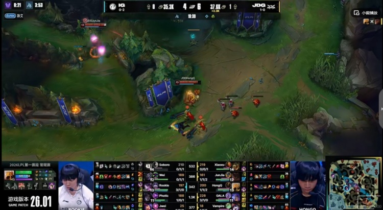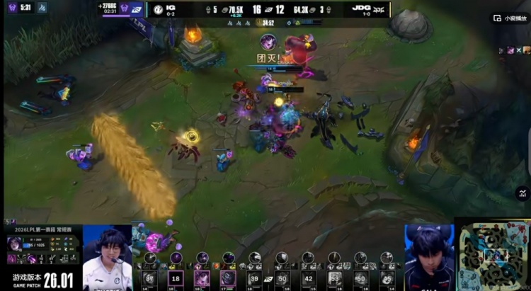 [34:24]JDG大龙逼团,Wei蒙多进场配合Rookie辛德拉抢到了大龙!残局Soboro奎桑提先倒,Xiaoxu鳄鱼交闪留人被Rookie辛德拉金身拉扯,Jwei妮蔻再次大招反手坐到五个!iG打出0换2开始追击,没人管的Photic卡莎+Rookie辛德拉输出拉满,4+1收割残局!iG团灭JDG一波结束首局比赛!
