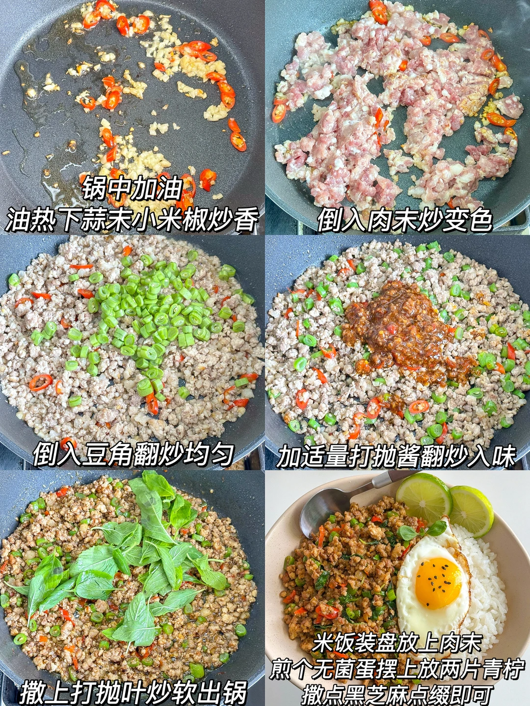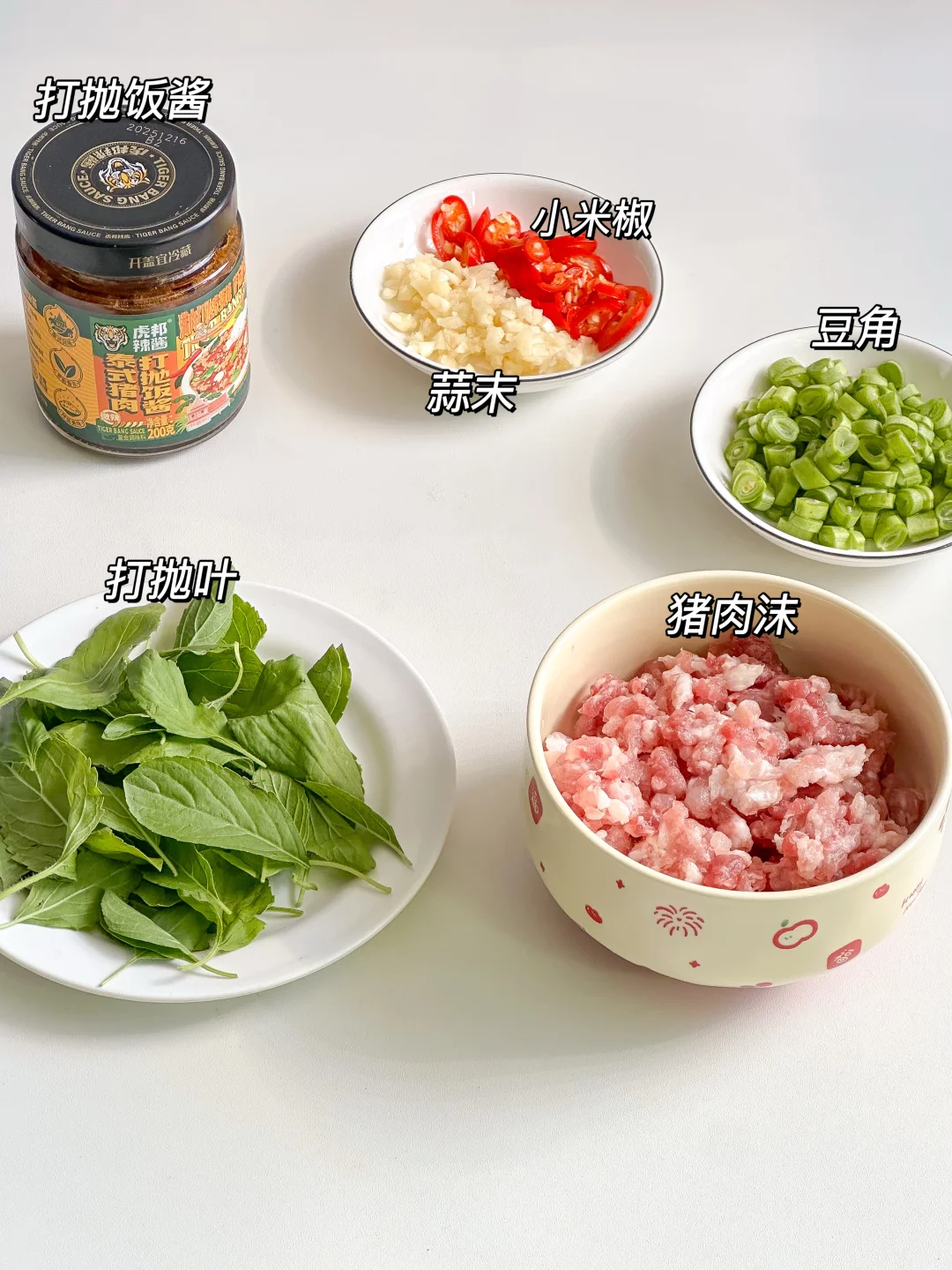 猪肉沫、蒜末、小米椒、打抛叶(罗勒叶)、豆角、无菌蛋