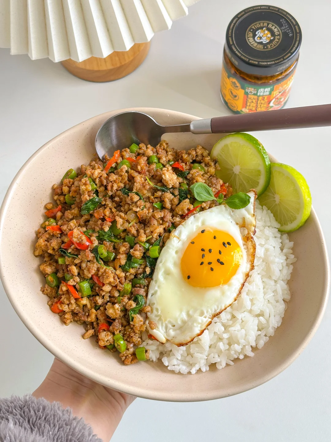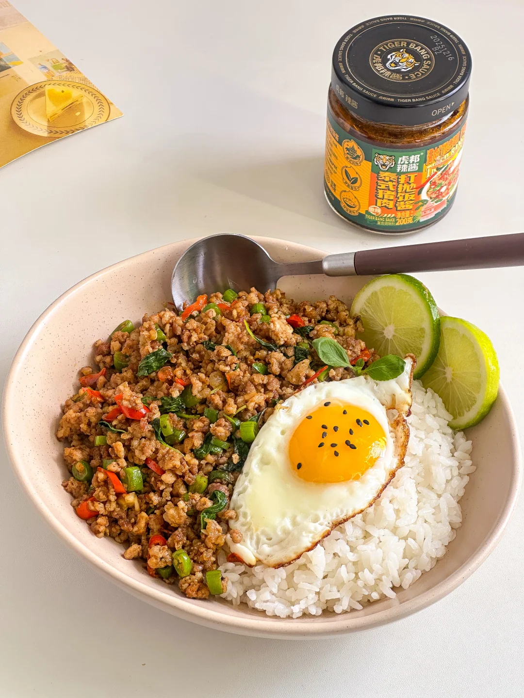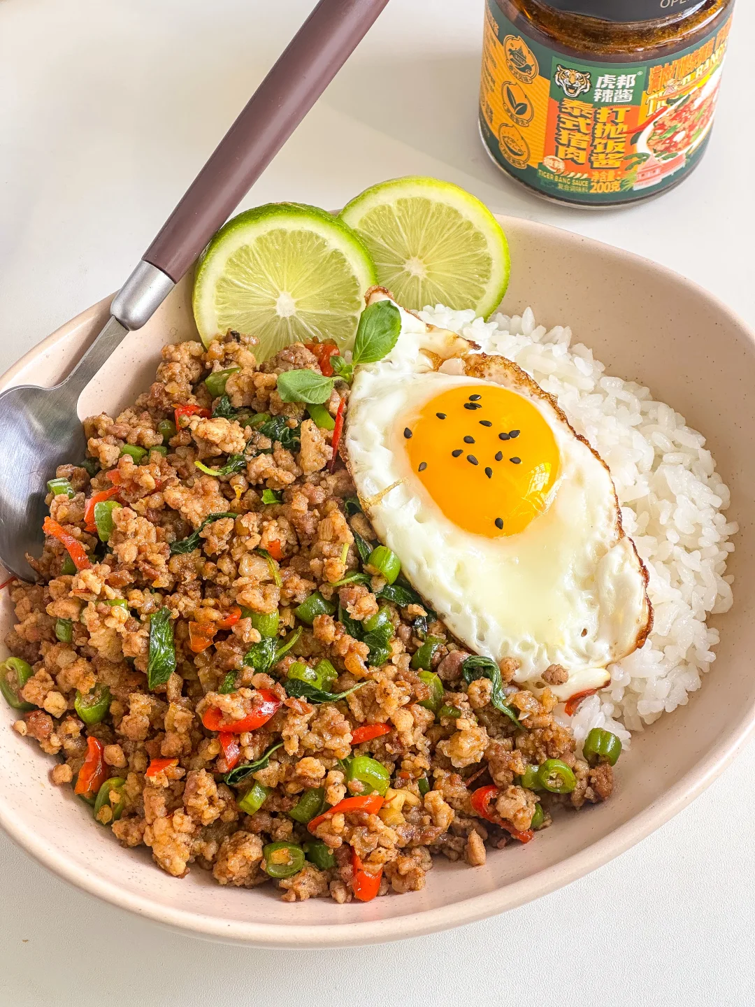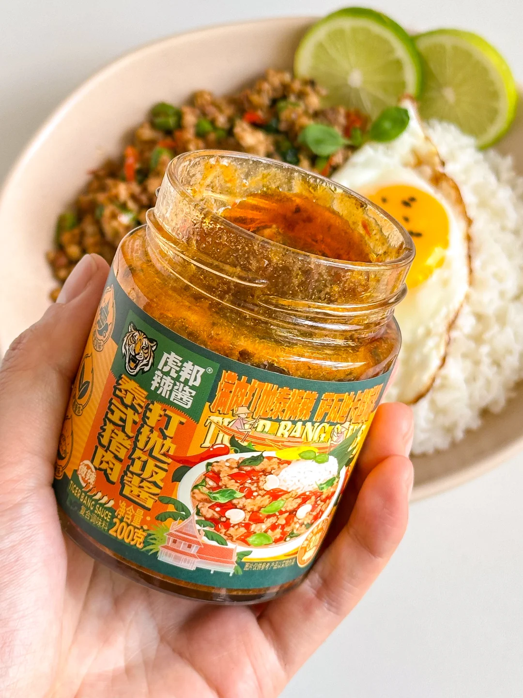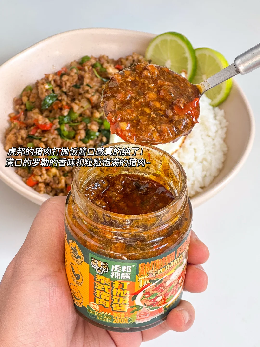 真的是香到姥姥家了🤤🤤虎邦的猪肉打抛饭酱口感真的绝了,打上一勺满满都是肉🥄!一口下去罗勒的香味伴着粒粒饱满的猪肉🐖,0添加的健康又美味👍🏻用它复刻出来的泰式打抛饭简单又好吃!真的是吃不腻~🥰