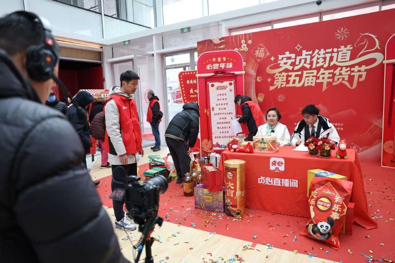 年货节直播带货。安贞街道相关负责人介绍,本届年货节将持续到正月十五,实现“四区六街”跨街区协作,不仅丰富了商品供给,也为参与商户拓宽了市场渠道。同时,今年活动首次实现线上线下同步举办,并联动多家商超作为年货节分会场,规模更大,品种也更丰富。