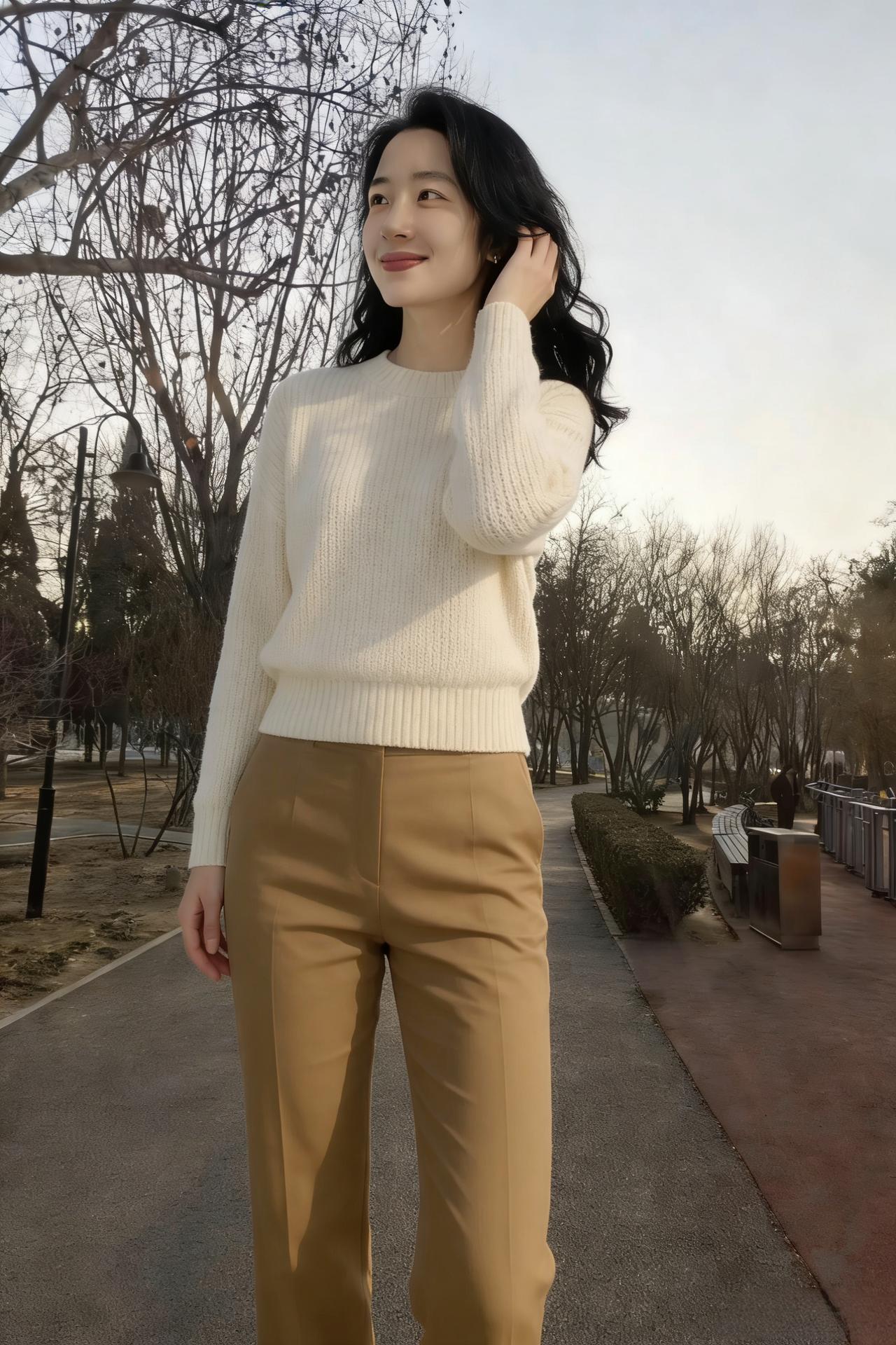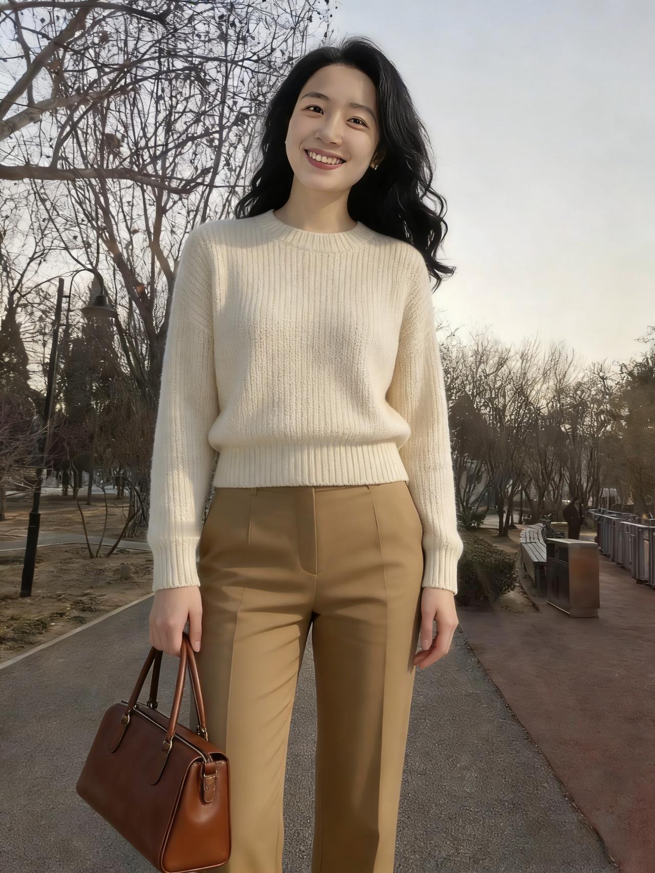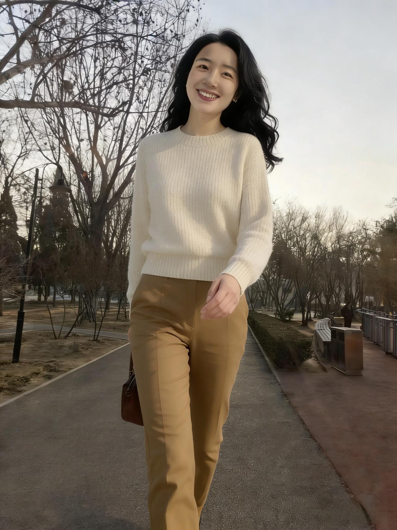 郊原余雪在,林径晓风轻。 素缕凝云色,驼裳衬日明。 提包循岸走,携笑踏霜行。 偶作回眸顾,惊鸿落满城。