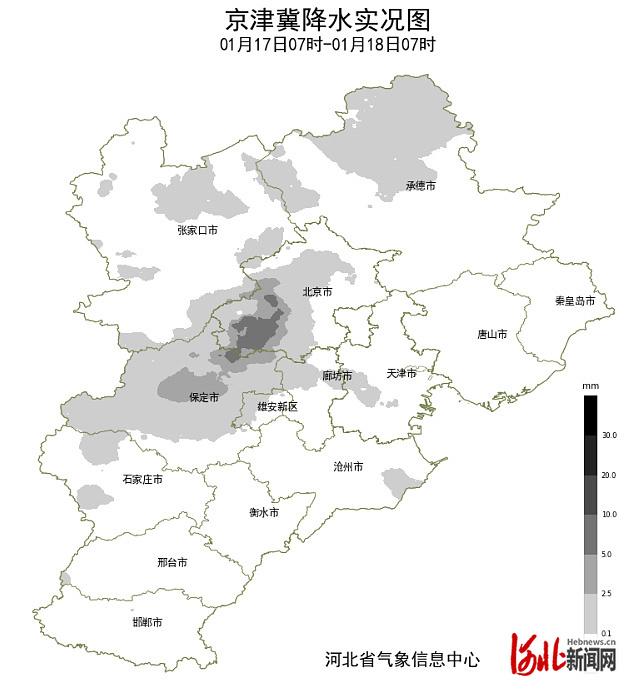 据河北省142个国家级气象站数据统计,1月17日7时至18日7时,张家口中北部、承德北部、保定、雄安新区、廊坊西部、石家庄中西部等地有25个站点出现降雪天气,降水区平均降水量为0.9毫米,保定易县最大为3.8毫米达中雪级别。石家庄城区出现微量降雪。