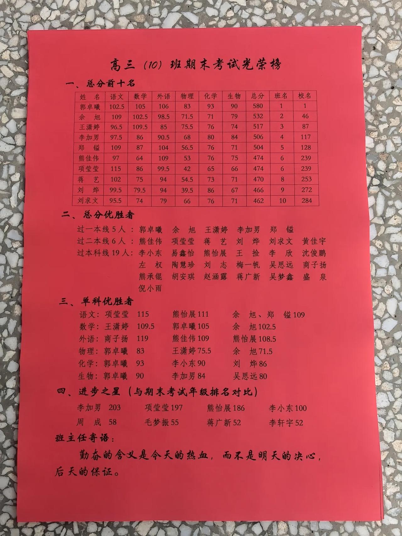 高三10班期末成绩光荣榜,班级第一名郭卓曦总分580分在年级15个班排第一名,与