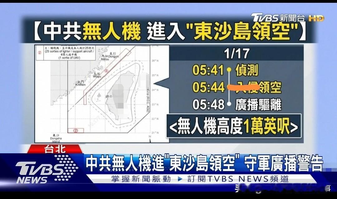 大陆无人机巡航东沙岛上空 台媒破防 昨天凌晨,台军发现一架大陆无人机在台省管辖的东沙群岛上空巡航,由于无人机在万米高空,东沙岛守军现有防御手段根本够不着,只能干瞪眼。最后台军声称,台军在岛上放广播喊话驱离,事后,台军方发声抗议。笑死了。 绿媒更是破防,声称我们太嚣张。