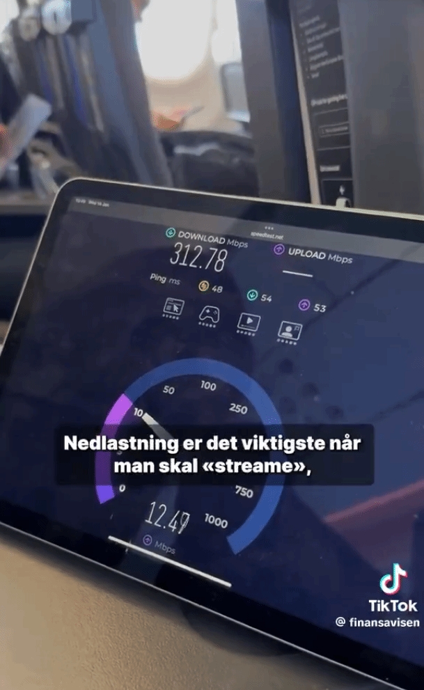 从实际体验来看,机上网络表现相当亮眼。有体验者表示,使用感受几乎与家用网络无异,测速结果甚至超过家中宽带——下载速度超过300Mbps,上传速度约12Mbps。