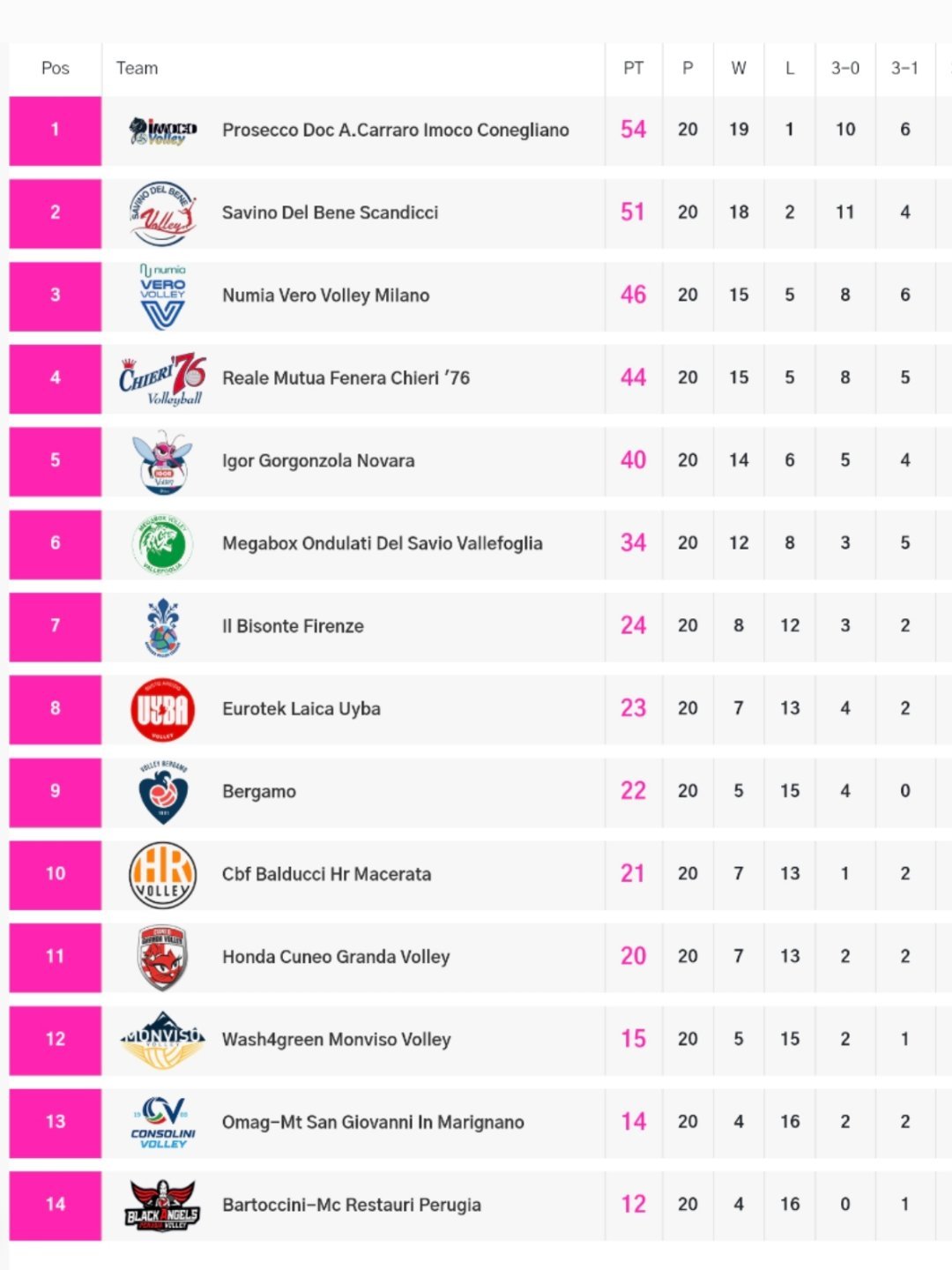【庄宇珊保级形势分析】意大利女排联赛 ❤️蒙·维·索:15分,5胜,剩余要打球队