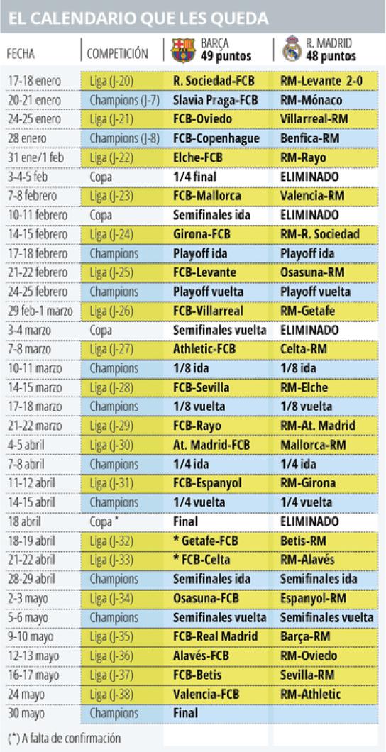 皇马在国王杯中失利,而如果巴萨能够进入4月18日或25日的决赛(具体日期需等待西班牙足协决定),那么巴萨将在西甲联赛期间额外多参加四场比赛。明天将进行国王杯四分之一决赛的抽签,下轮比赛日期为2月3日、4日和5日。