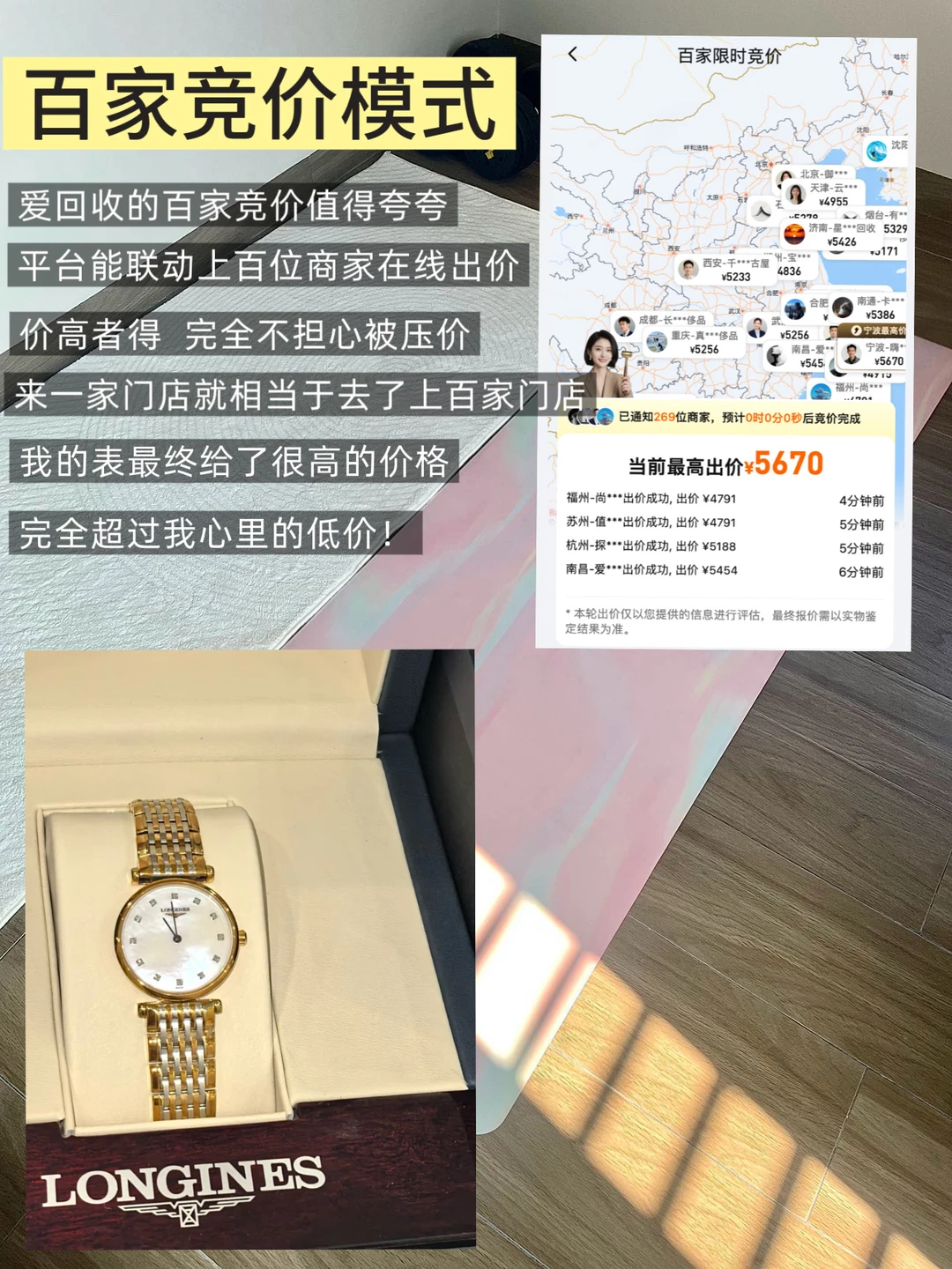 谁懂! 自从健身入手了运动手表⌚️之后,好久不戴的浪琴手表就放在柜子里就没动过了,已经落灰了都….. 自从上次的lv在爱回卖出心动💗价格后 就已经被爱回收圈粉了! 这次打算把已经落灰的腕表再回收掉掉回回血🤓 他们家是上市企业,有2000+线下门店📍覆盖快300个城市 我家附近就有好几家呢 最后直接选了一家最近的门店做了回收检查,门店的工作人员很专业,全程沟通清楚,不催不赶的态度非常好! 他们是百家竞价系统,有100多位回收商在线给价,不用自己一家家门店去比价了,受到供需关系影响,最终给的价格也出乎我的预料,比预期高了几百块钱,而且就按照竞价结果来成交,完全不用担心卖亏! 只要货品没问题,就可以当面收货、现场打款💰 从验表到最终收款 全场就20多分钟👍🏻快得很😌