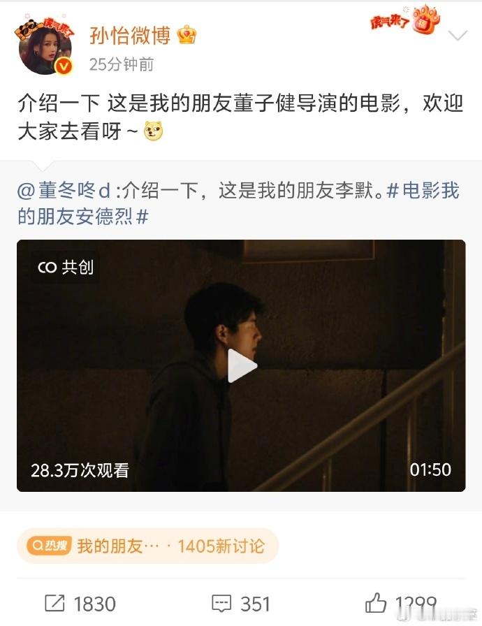 孙怡回应了董子健宣传董子健新电影《我的朋友安德烈》;孙怡喊董子健朋友:“介绍一下 这是我的朋友董子健导演的电影,欢迎大家去看呀~”董子健也回复了孙怡“谢谢你,我的朋友” 2025微博之夜爆款创作大赛