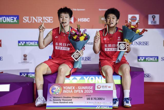 当地时间1月18日,在印度新德里举行的2026年印度羽毛球公开赛女子双打决赛中,中国组合刘圣书/谭宁2比0战胜日本组合福岛由纪/松本麻佑,夺得冠军。