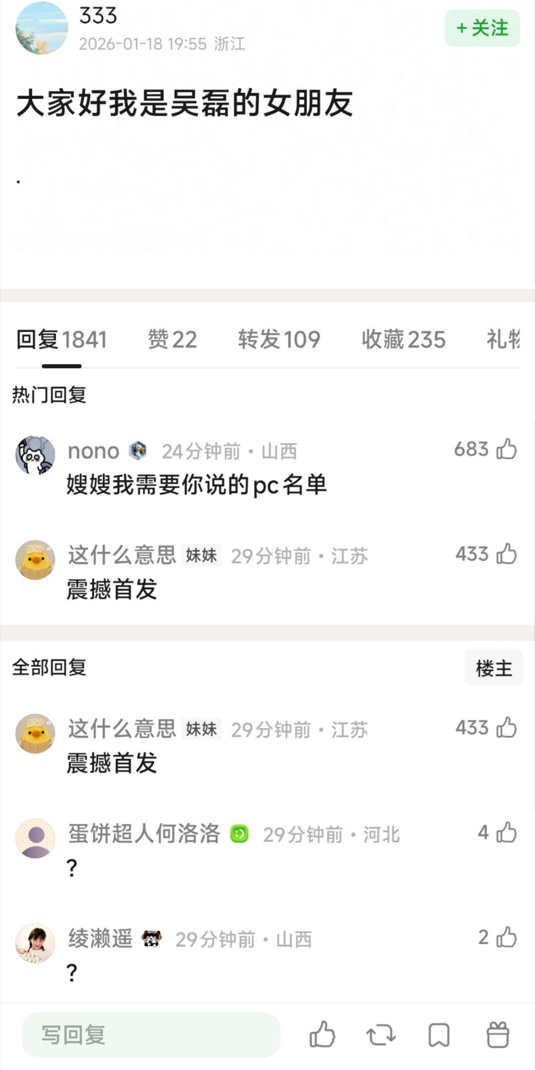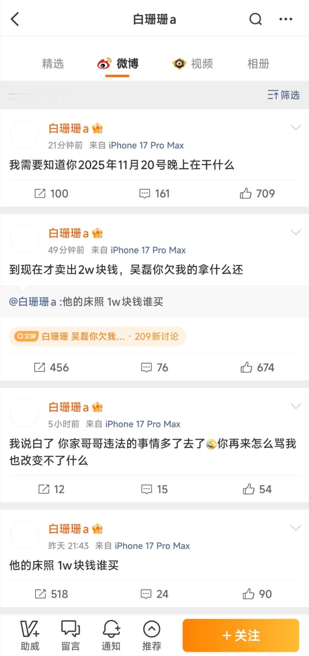 白珊珊 吴磊你欠我的拿什么还内娱又一魔嫂!不过这个吴磊是是演员吴磊,还是配音员或其他重名者呢无图无真相有点炒作的嫌疑吧如果是艺人“吴磊”大名公开售卖隐私照是不是违法了曾自爆比另上一位内娱魔嫂“司晓迪”更年轻貌美,且“睡过的男明星更帅”,看来白珊珊对娱乐圈很了解啊!豆瓣有人跳出来说她是吴磊女朋友,白珊珊已回应是本人