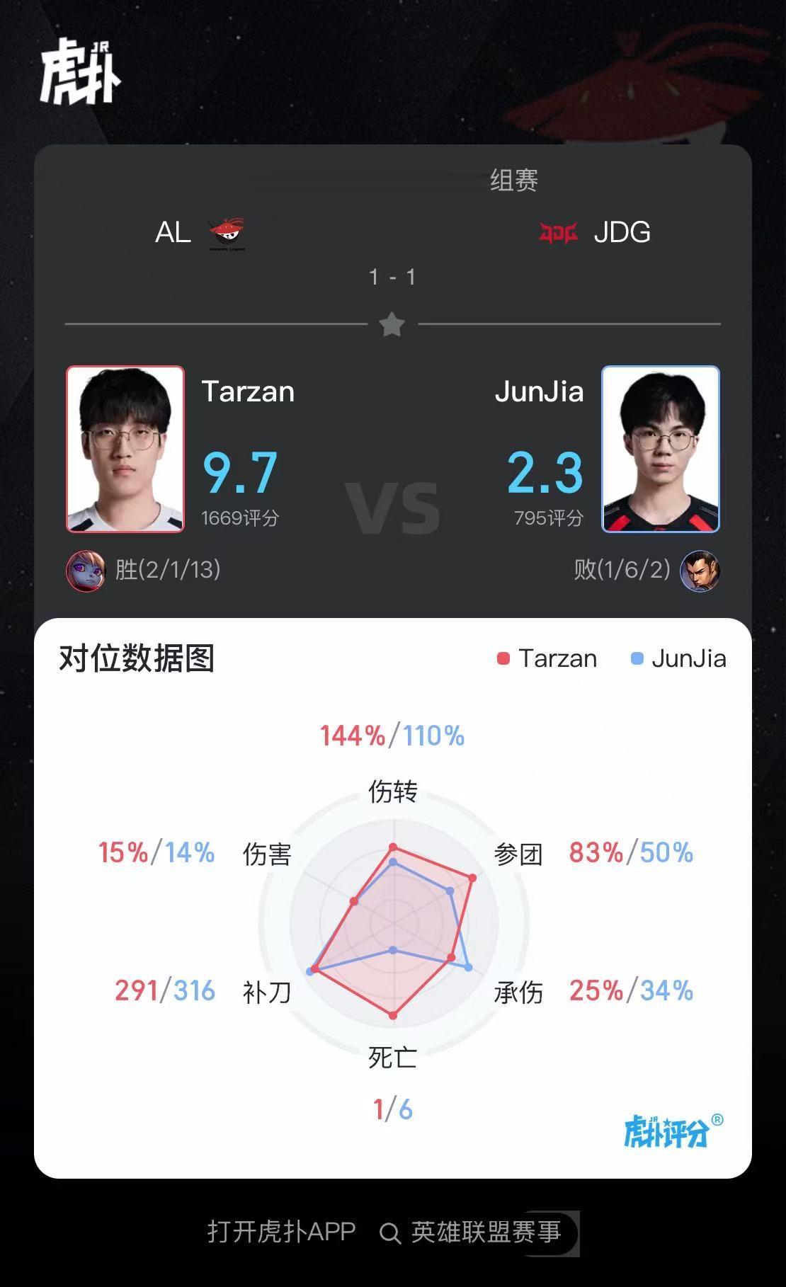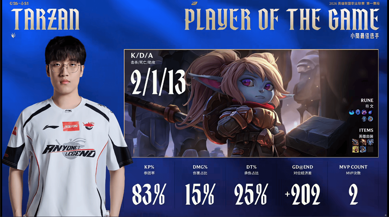 Tarzan波比打出2/1/13战绩,斩获AL对阵JDG第二局MVP