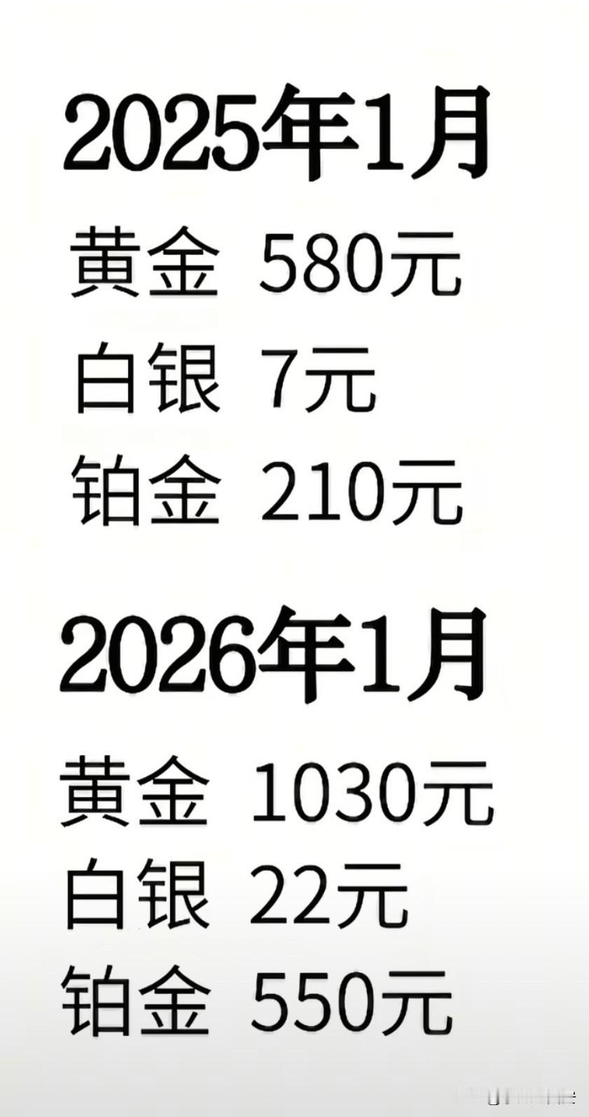 2025年年初到年末黄金、白银、铂金价格坐上了过山车🎢一路冲高 2026年有色金属板块, 这三者价格依旧坚挺 2025年1月到2026年1月 黄金价格从580元一克涨至1030元 白银价格从7元一克涨至22元一克 铂金价格从210元一克涨至580元一克。 黄金白银价格 铂金价格