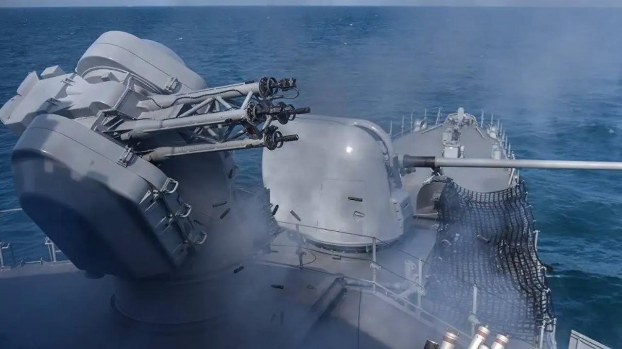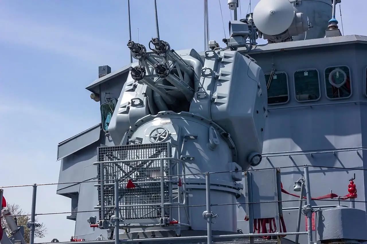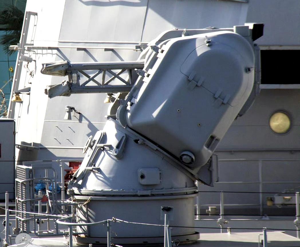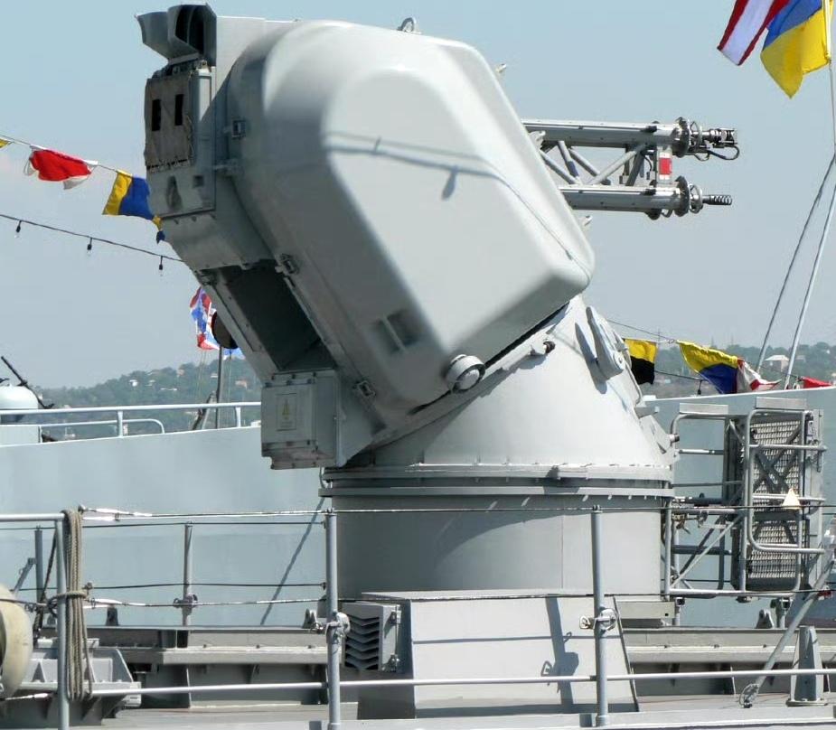 最大射速约 3400 发 / 分,有效射程约 2 千米,”歪头杀“的瑞士“海天顶”4 管 25 毫米近防炮。