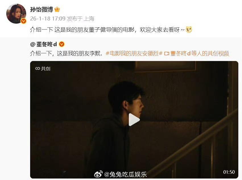 孙怡 我的朋友董子健孙怡宣传董子健新电影董子健喊孙怡我的朋友转发董子健微博为其新