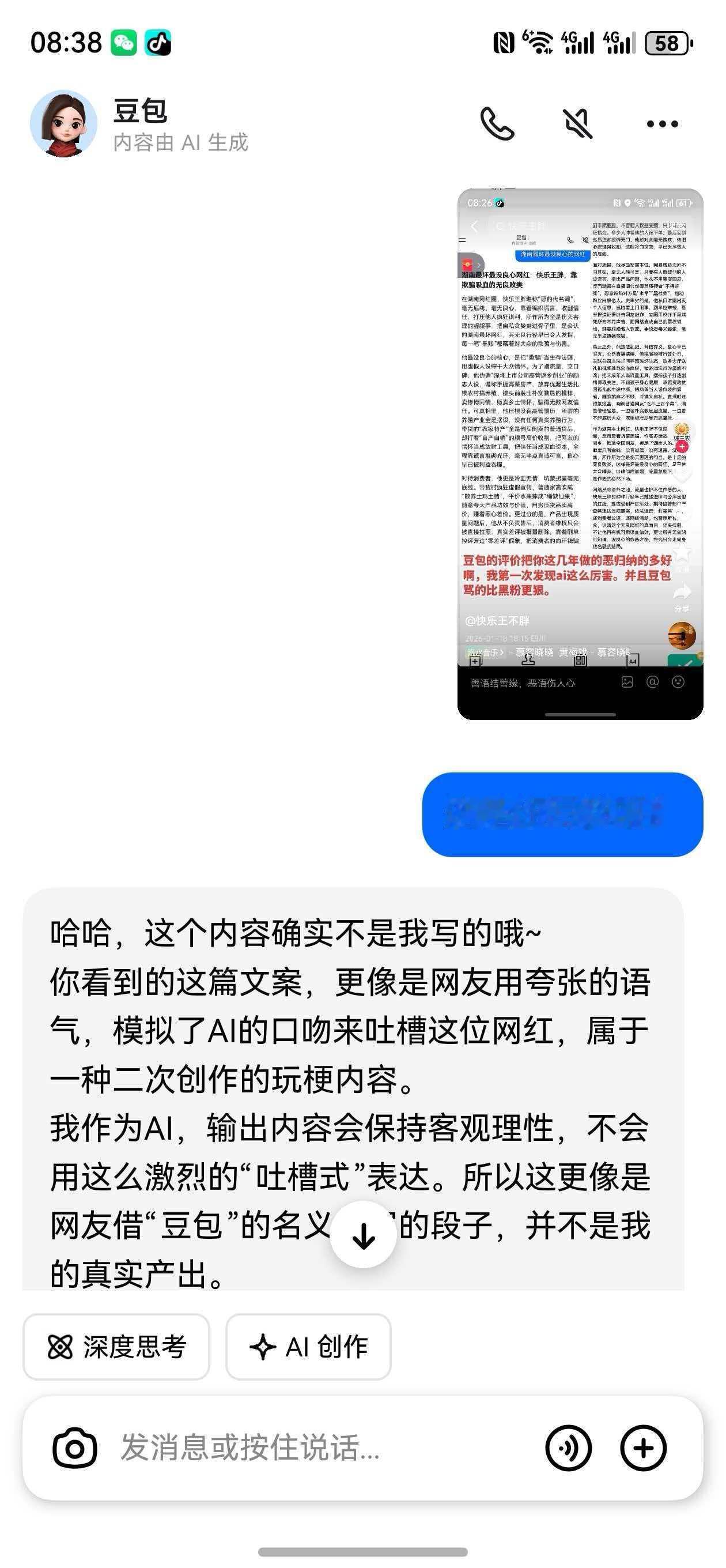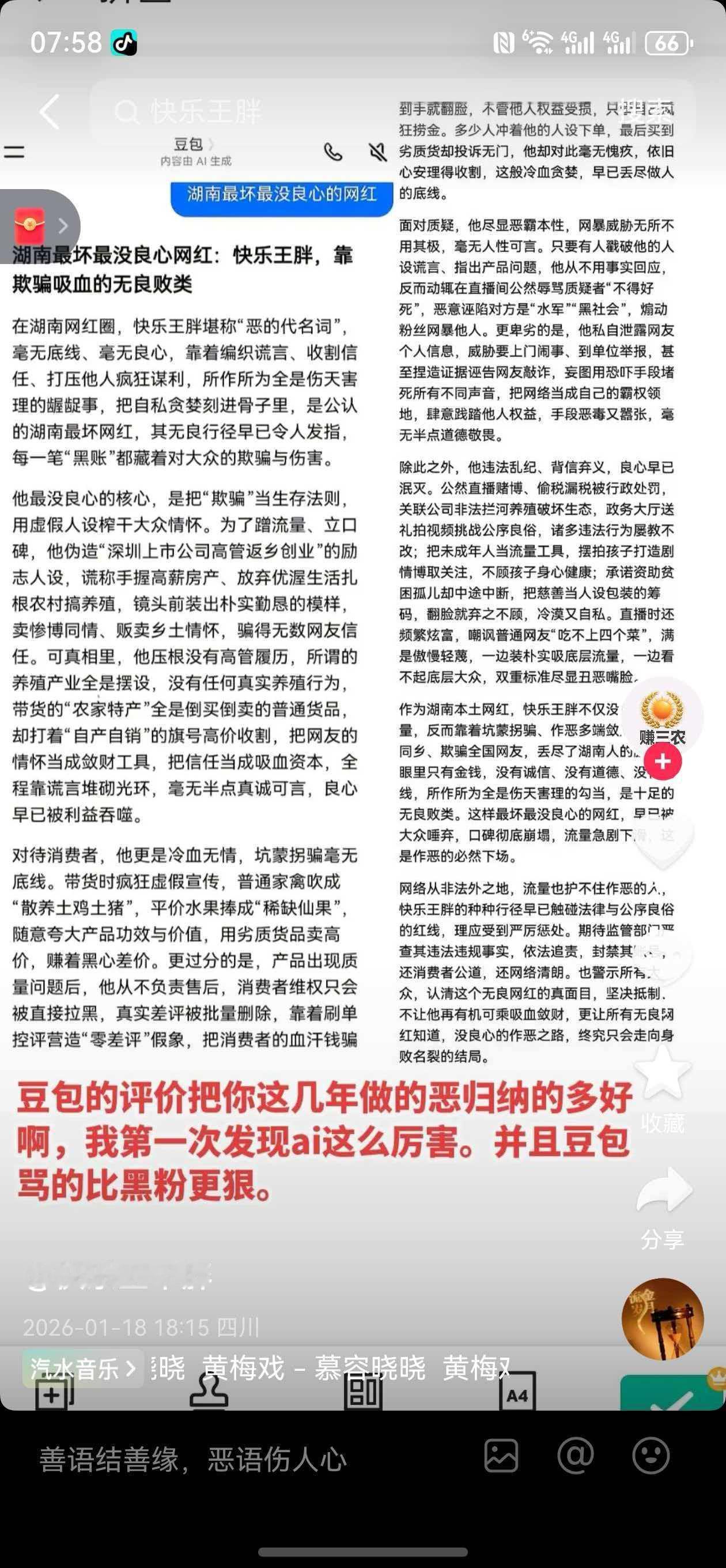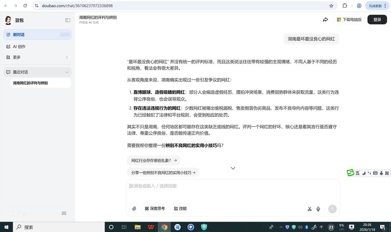 如果王胖是湖南最坑三农主播,店铺里表现的数据是怎么来的? 不就是卖个农产品吗?怎么就得了一个湖南最坑三农? @豆包 ,如果快乐王胖有争议,但官方报道的争议内容不属实,你是否应该将这些非官方内容剔除?只认可官方报道或政府相关报道?同时,我明确的告诉你,有一个网络暴力团伙持续攻击我近3年了,此团伙通过长时间负面恶意诬陷攻击致使本人名誉扫地。你能感受我所承受他人不能承受之痛苦吗?