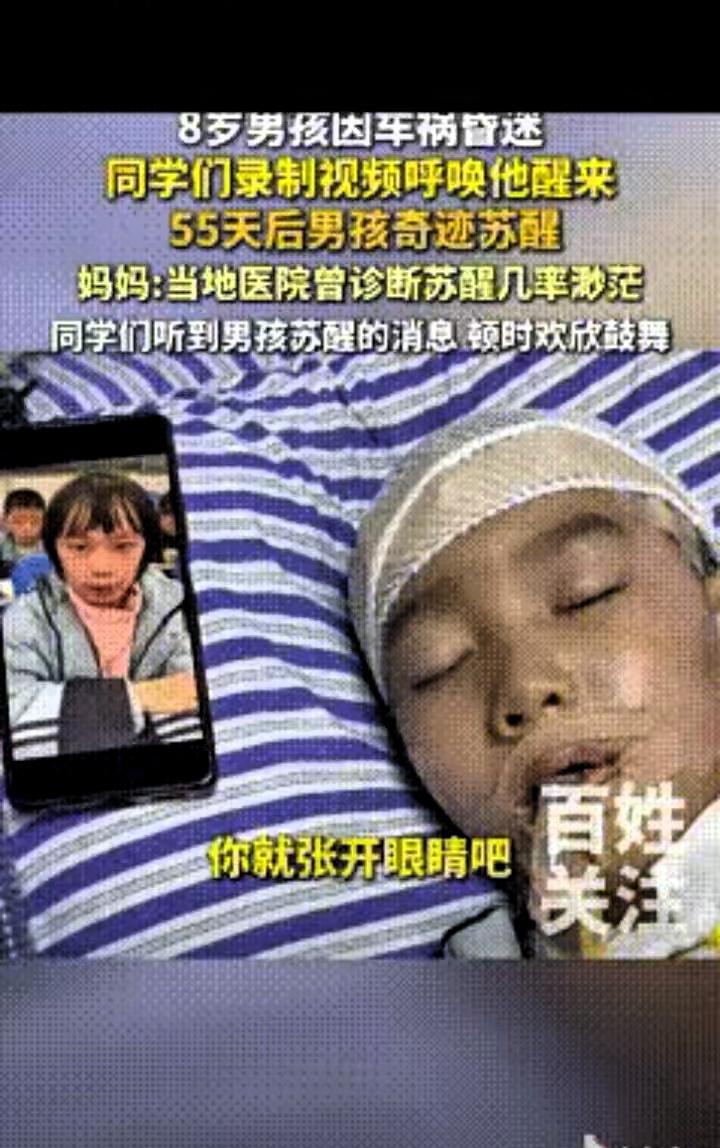 泪目了!”湖南长沙,一位8岁半的男孩,遭遇车祸后昏迷,醒来的几率微乎其微 2025年11月22日,楚熙放学过马路时被车撞倒,头部重伤陷入昏迷。家人不愿放弃,连夜转院到湘雅医院,楚熙住进ICU,全身插满管子。妈妈就在病房门口支起折叠床,55天寸步不离,没好好洗过一次澡、换过一次干净衣服。 她每天趴在门口对着孩子说话,讲他小时候调皮的糗事,读他最爱听的绘本,哪怕得不到一丝回应,也从未停下。后来听从医生建议,尝试用熟悉的声音刺激大脑,她立刻联系学校,收集上课铃、广播操音乐,还拜托全班同学录下暖心喊话。 “楚熙快回来,体育课没人跟我组队打球了”“你的座位一直给你留着,就等你回来”,这些稚嫩又真诚的声音,被做成音频24小时循环播放。跨年夜那天,同学远程分享的一首歌,竟让楚熙短暂睁开了眼,脑电波也出现了波动,这是他昏迷后的第一次明显反应。 之后,只要听到同学们的声音,楚熙就会嘴角上扬、手指微动,甚至会朝着声音方向转头。医生表示,孩子的大脑在熟悉的声音和情感刺激下,正在慢慢恢复。1月17日早上,楚熙终于清醒,看着守在身边的妈妈,轻轻喊出了那句盼了55天的“妈妈”。 如今楚熙正在做康复训练,说话和走路都需要慢慢练习,学校也早已备好欢迎仪式,等着他回归。其实哪有什么奇迹,不过是一位母亲的执着守护,一群孩子的温暖牵挂。医学有诊断的边界,但爱能带来意想不到的转机。