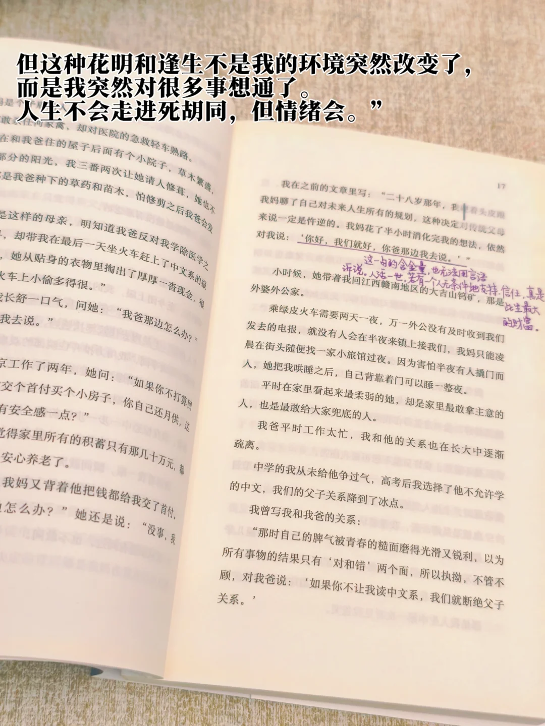 “无数次我觉得自己的人生要完蛋了,后来发现只要自己还活着,人生就不会完蛋,一定会柳暗花明,绝处逢生。但这种花明和逢生不是我的环境突然改变了,而是我突然对很多事想通了。人生不会走进死胡同,但情绪会。”