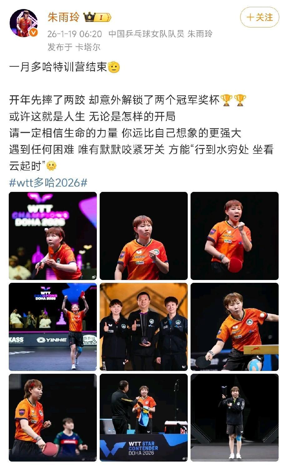 朱雨玲社媒分享多哈球星挑战赛比赛结束后总结!并晒出与目前主管教练陈振江教练一起合影! 朱雨玲提及“开年先摔了两跤”意外解锁两座冠军奖杯。并提及面对困难,咬紧牙关,才能致胜! 非常励志的朱雨玲。希望日后更多发展!