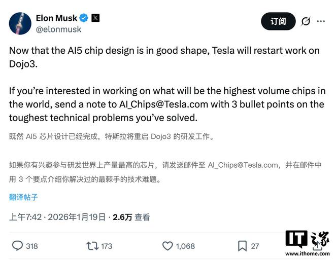 IT之家1月19日消息,今天早间,马斯克在X平台发文宣布,随着AI5芯片设计完成,特斯拉将重启超级计算机项目Dojo3的开发工作。