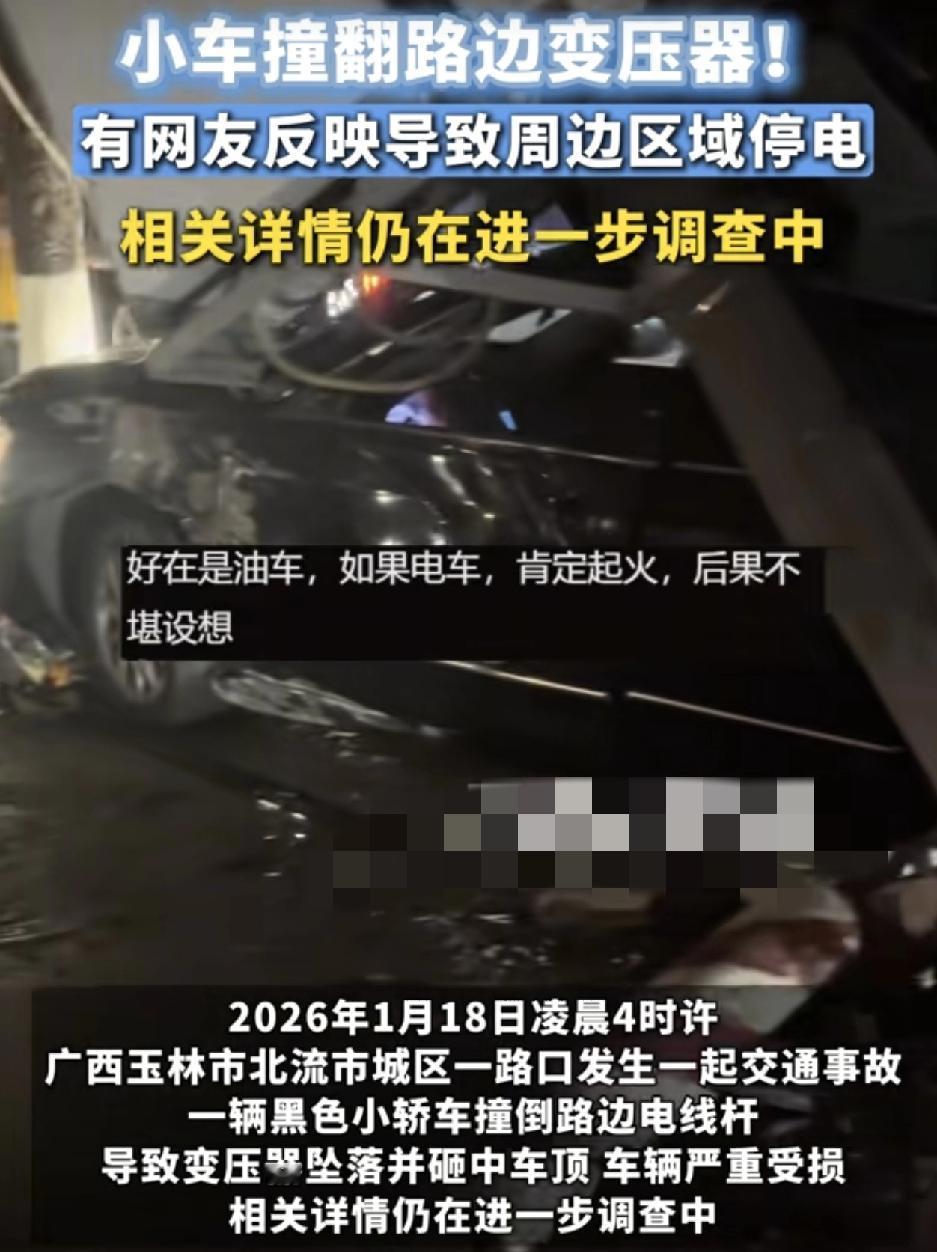 广西玉林一小车夜间行车时不小心撞倒路边的电线杆,导致周边的居民一大片面积停电,有居民说小车是撞到了路边的电线杆,然后砸中变压器,变压器砸下来,刚好砸到了车顶,车身严重受损。有网友说这情况也挺危险的,特别是遇上了电车,会不会瞬间爆炸。