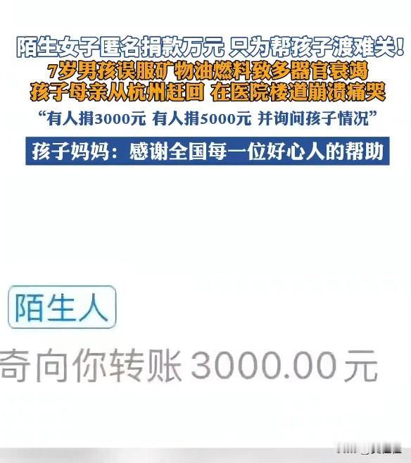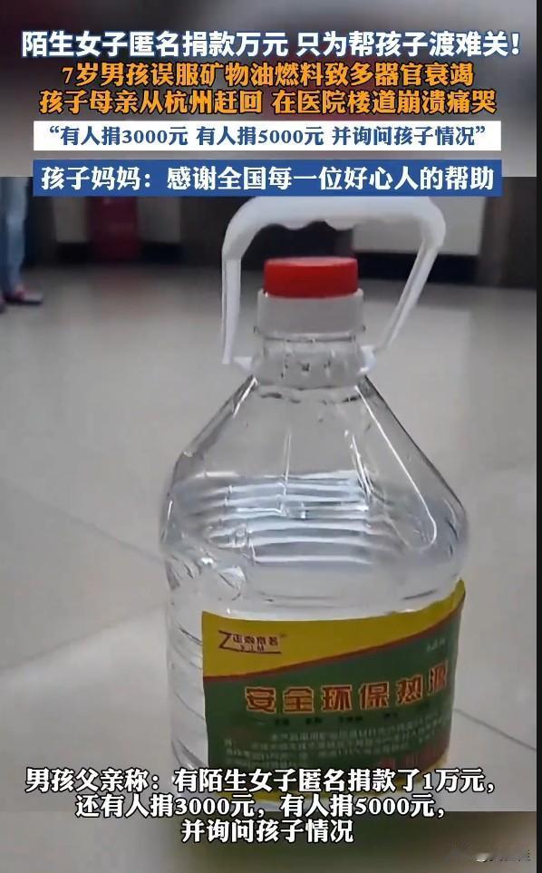 雪中送炭!误喝矿物油进ICU的7岁男孩,被热心人捐款救急! 河南一名7岁男孩,误把无色无味的矿物油燃料当成白开水,冲了感冒药喝下去,结果导致多器官衰竭,紧急送进ICU抢救。 孩子妈妈远在杭州打工,接到消息连夜赶回,在医院楼道里崩溃痛哭。绝望之际,四面八方的温暖却涌了过来:一位陌生女子直接匿名转账1万元,还有人捐3000元、5000元,不少好心人专门发来消息询问孩子的情况。 孩子妈妈哽咽着说:“真的太感谢全国的好心人了,是你们给了我家孩子活下去的希望。” 一瓶看起来人畜无害的矿物油,差点毁掉一个家庭;素不相识的善意,却在寒冬里撑起了一片天。愿孩子能挺过难关!