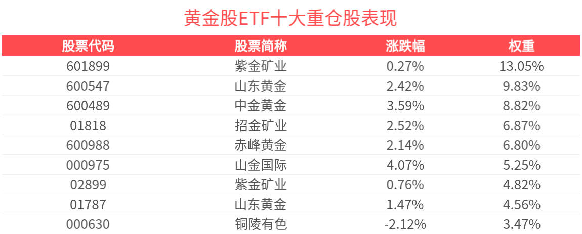 黄金股ETF紧密跟踪中证沪深港黄金产业股票指数,业务涉及黄金采掘、冶炼、销售的黄金产业链个股,截至2025年12月31日,指数前十大权重股分别为紫金矿业、山东黄金、中金黄金、赤峰黄金、招金矿业、山金国际、山东黄金、紫金矿业、紫金黄金国际、湖南黄金,前十大权重股合计占比63.58%。(以上所列股票仅为指数成份股,无特定推荐之意)