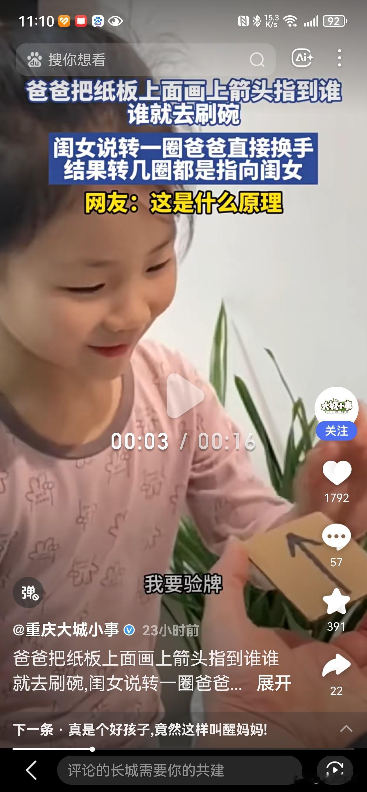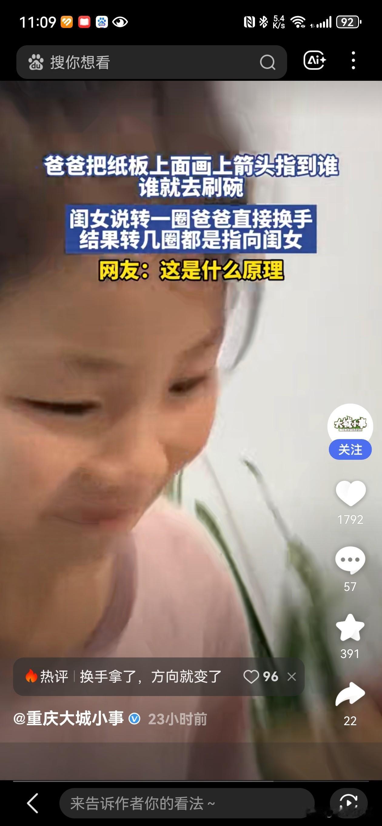 近日,一位父亲用画有箭头的纸板决定家庭洗碗分工,通过旋转纸板声称“指到谁谁刷碗”。闺女说转一圈爸爸直接换手,结果转几圈都是指向闺女,直接整懵女儿。‌‌ 这场家庭“洗碗大赛”瞬间点燃了网友们的热议,也让人忍不住反思:在看似简单的家庭分工中,隐藏着多少关于公平、责任与爱的深层次问题? 事情的起因很简单:一位父亲为了让家庭洗碗变得“公平”又有趣,设计了一个旋转纸板,上面画着箭头,声称“指到谁谁刷碗”。然而,事情的发展却出乎意料——每次转动,箭头都指向女儿,让她哭笑不得。女儿调侃:“转一圈爸爸就换手,结果转几圈都指我,太懵了。” 这看似一场“游戏”,却折射出家庭中责任分配的微妙心态。父亲用“随机”的方式试图公平,实际上却无意中强化了“责任偏向”的偏差。这不仅仅是洗碗的趣味游戏,更是一面镜子,映照出我们在家庭中潜藏的“责任分配不公”和“潜在偏见”。 更深层次地看,这个故事引发了我们对“公平”的思考:在家庭生活中,谁才是真正的“公平裁判”?难道用“随机”或“游戏”来决定责任,就能解决根本的问题吗?还是说,这只是一种逃避? 或许,这个家庭的趣味小插曲,提醒我们每个人都应正视家庭责任的分配。公平不应靠“旋转纸板”来决定,而是需要理解、沟通和共同承担。正如这位父亲的“趣味”尝试,或许我们都该在家庭中扮演更成熟、更负责任的角色,用真心和行动,营造一个温暖、平等的家庭环境。 看完这场“洗碗游戏”,你会不会也开始反思:你家里的“公平”是怎么来的?是不是也需要一次“旋转”呢?欢迎留言分享你的家庭故事,让我们一起探讨如何让责任变得更公平、更温暖。