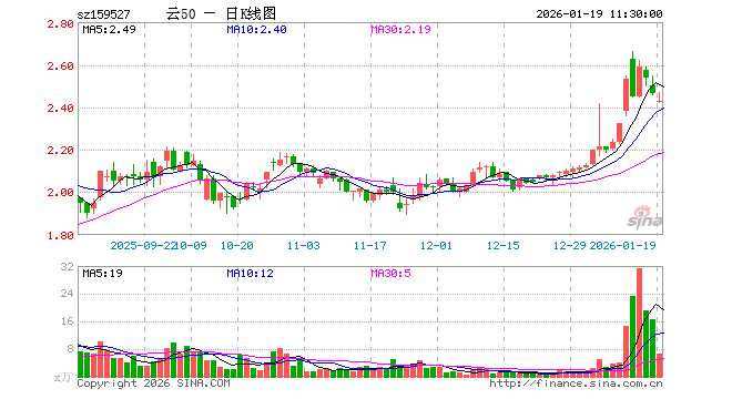 1月19日,截止午间收盘,云计算ETF广发(159527)跌1.54%,报2.426元,成交额1635.61万元。云计算ETF广发(159527)重仓股方面,中际旭创截止午盘跌1.78%,新易盛涨1.44%,科大讯飞跌3.33%,中科曙光跌0.45%,浪潮信息跌3.95%,金山办公跌1.63%,紫光股份涨0.78%,恒生电子跌2.05%,润和软件涨0.31%,拓维信息跌1.08%。