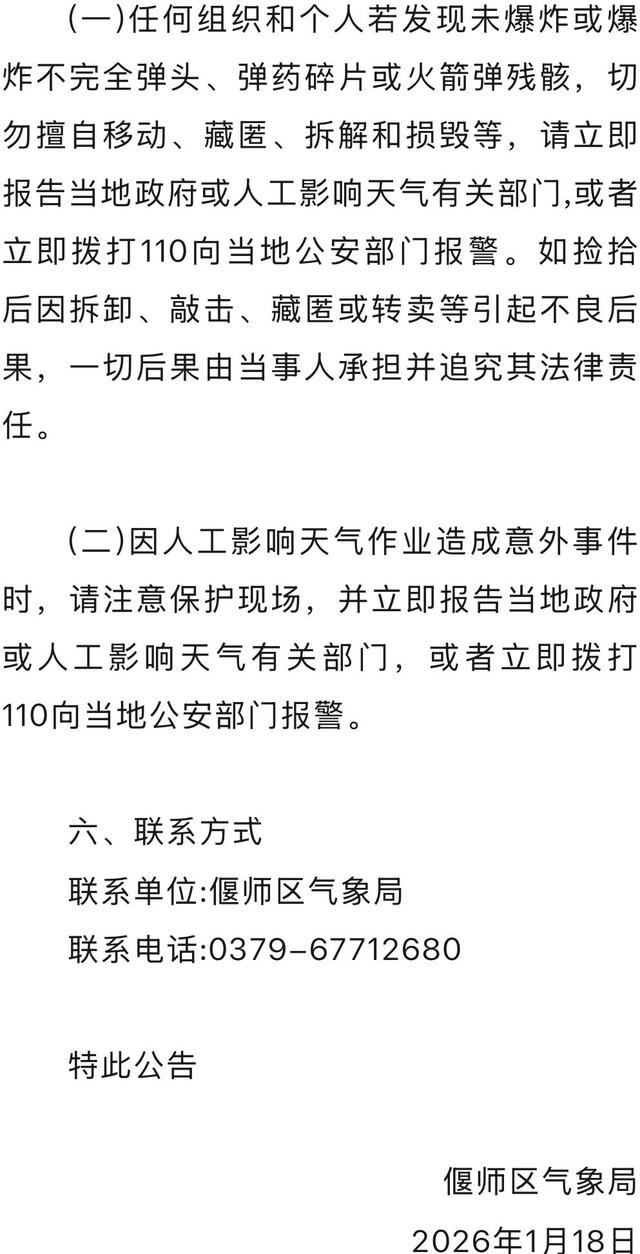 (二)偃师区域范围内可能掉落未爆炸或爆炸不完全弹头、弹药碎片或火箭弹残骸。