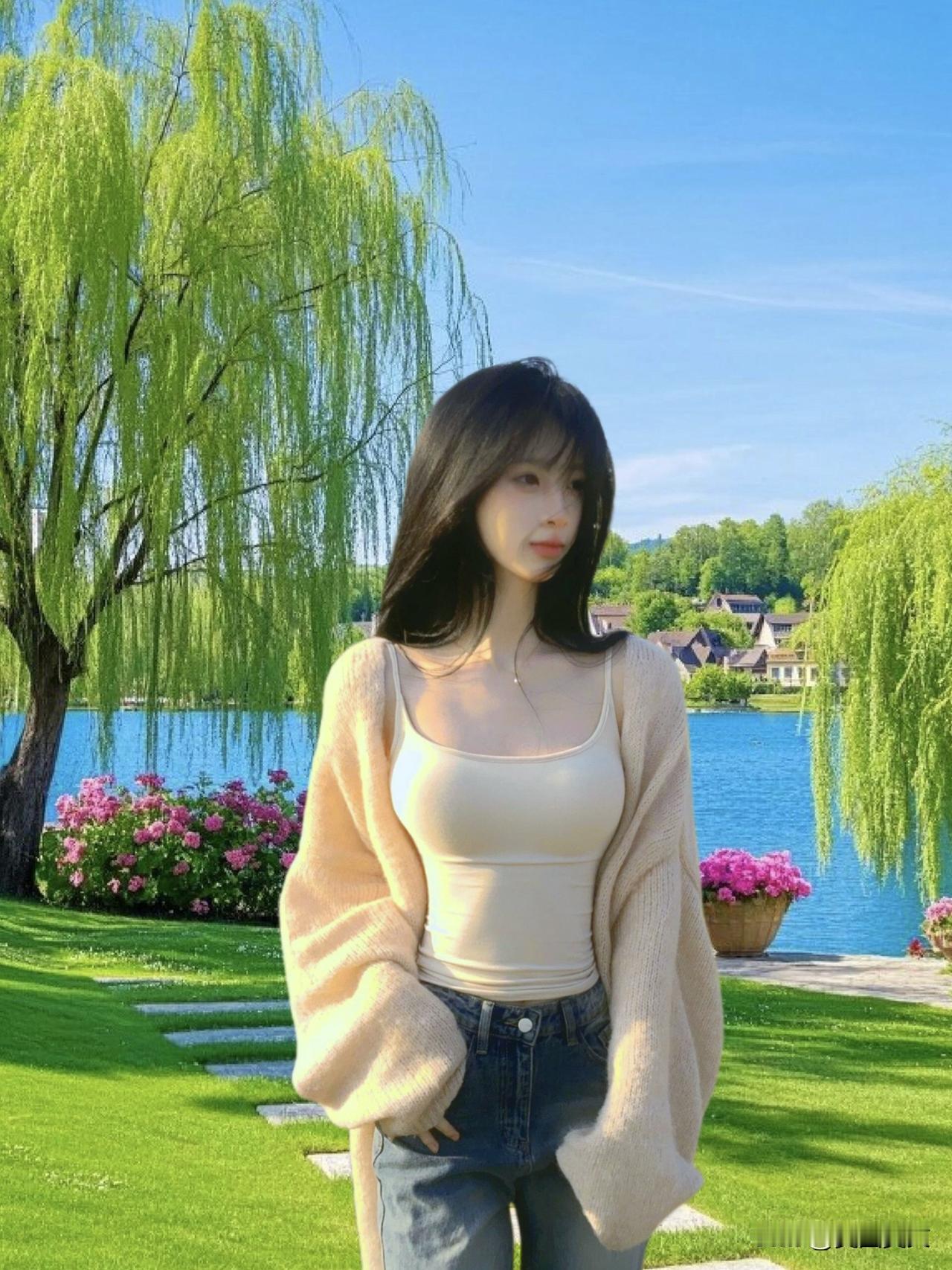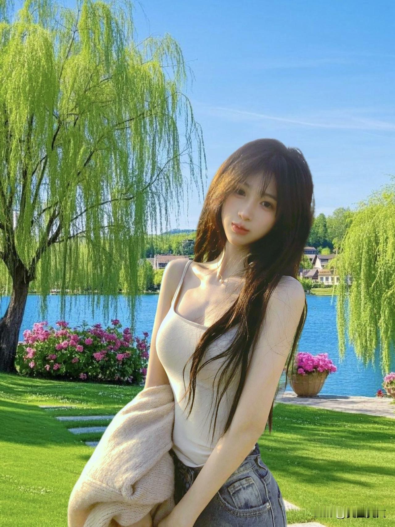 在湖畔的少女,笑靥如花,阳光洒满她的脸庞。