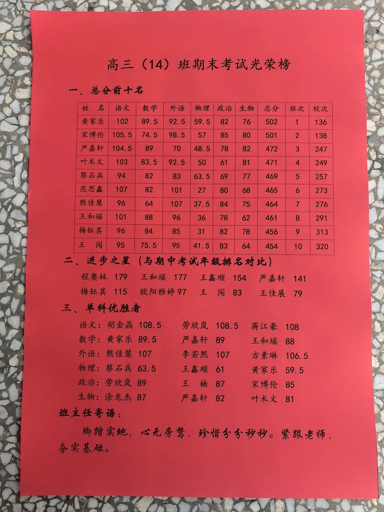 高三13班期末考试光荣榜,班级前10名500分以上只有1人,剩余9人都是400多分,班级第一名程峰总分510在年级排名104,444分在年级排名350名。 高三14班与13班期末考试成绩相当,前10名500分以上2人,班级第一名黄家乐和班级第二名宋博伦总分502和501在年级排名136和138,第十名454分年级排320名。 高三普通班期末考试成绩班与班差别不多,大部分都是本科和大专,公办二本和一本少之更少,重点班能考上一本的也就10来个。
