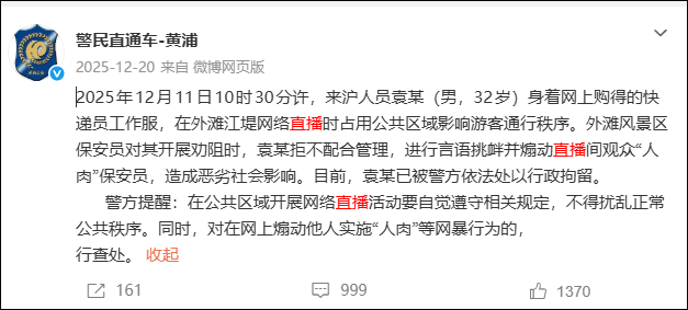 有人在外滩进行网络直播已经不是第一次了。2025年12月,袁某(男,32岁)身着网上购得的快递员工作服,在外滩江堤网络直播时占用公共区域影响游客通行秩序。外滩风景区保安员对其开展劝阻时,袁某拒不配合管理,进行言语挑衅并煽动直播间观众“人肉”保安员,造成恶劣社会影响。