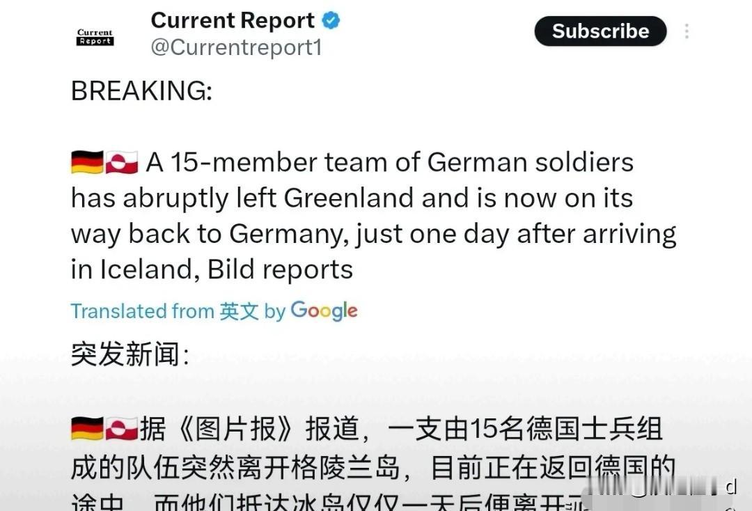 关税威慑立竿见影 德国24小时撤出格陵兰 德国被特朗普关税吓得立马怂了。1月17日特朗普官宣,2月1日起对欧洲八国输美商品加征10%关税,6月起升至25%,逼各国同意美国“购买”格陵兰岛。不到24小时,18日德国就紧急撤回15名驻格陵兰军事人员,这批人16日才抵达,预定任务全被取消。 目前格陵兰岛仅剩24名欧洲驻军,法国15人、瑞典3人、挪威2人、芬兰2人、英国1人和荷兰1人。德国国防部没说明撤离原因,但外界都清楚,这是怕贸易受损提前认怂。毕竟德国对美贸易依赖度不低,真扛上关税吃亏的是自己。 特朗普的关税大棒就是明晃晃的勒索,欧洲八国虽发联合声明说要团结应对,还喊着启动反胁迫工具,但德国这波溜号直接拆了台。格陵兰岛是北极航道关键节点,美国早就馋这块肥肉,派兵只是借口,实则想把欧洲势力挤走。 欧洲联盟看着像模像样,遇事却各打各的小算盘,美国正好逐个拿捏。剩下的国家是硬扛到底还是跟着跑路?评论区来聊聊。