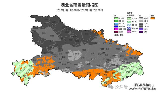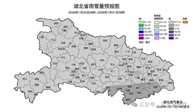 1月19日08时-20日08时,鄂西北、鄂东北西部阴天有大雪到暴雪;鄂西南东部、江汉平原、鄂东北东部小雨转中到大雪、局地暴雪;其他地区小雨转雨夹雪。全省大部分地区有短时冻雨或冰粒。最高气温鄂西北-1~3℃、鄂西南、鄂东南8~12℃、其他地区3~7℃,最低气温北部-5~-2℃、南部-2~1℃,偏北风4到6级、阵风7到9级。