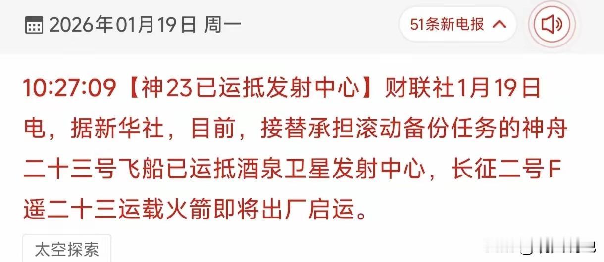 今日好喜讯接踵而来,神20“带伤”成功着陆,很可喜的是神23提前近半年,进驻酒泉卫星发射场待命,这就是中国航天的加速度。 中国载人飞船发射沿用“发一备一”的惯例,先前神22由于作为神21的备份船,因神20炫窗玻璃被空间碎片撞击,为保障航天员生命安全,神20航天员“搭乘”神21飞船返回,神22号飞船也不得不提前不载人发射,前往中国空间站,当前正在中国太空母港,执行神21载人飞天任务。 新华社快讯:目前,接替承担滚动备份任务的神舟二十三号飞船已运抵酒泉卫星发射中心,长征二号F遥二十三运载火箭也即将出厂启运。这意味着神23作为神22备份船提前待命。 神20载人飞船因撞击“受伤”,今日已携“行李”成功返回东风着陆场,这样来看,神22载人飞行任务将史无前例的缺失。也表明载人飞行势必带来前所未有的不确定性,中国航天秉持以人为本发展理念,做好万全准备,就能把损失降到最低。 再次证实中国航天是一支特别能战斗队伍,加班加点最大眼度压缩飞船的生产工期,高质高量完成神23载人飞船备份待命发射任务!为中国航天加油喝彩!