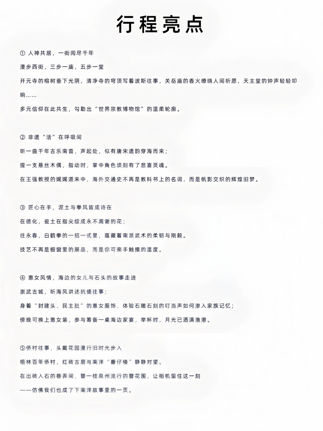 泉州,一座拥有1300多年历史的国家历史文化名城,也是联合国教科文组织认定的“海上丝绸之路”起点城市。2021年,“泉州:宋元中国的世界海洋商贸中心”成功列入《世界遗产名录》,包含22处代表性遗产点,展现了宋元时期泉州作为全球海洋贸易枢纽的繁荣景象。泉州不仅文化底蕴深厚,还保存了大量非物质文化遗产、古建筑、传统村落和丰富多彩的民俗活动。 · 2026年,我们将开启泉州人文游学之旅,深度解锁这座拥有多元文化的历史名城,欢迎同频者一起加入我们的队伍~~ · 行程安排: DAY 1: - 抵达泉州 · DAY 2: - 开启“人神共享烟火”City walk - 打卡开元寺、清净寺、关岳庙、天主堂等宗教地标,感受多元文化交融; - 泉州海交馆,聆听王强教授精讲,沉浸式了解泉州作为海丝起点的辉煌过往; - 非遗木偶戏场所,观看大师表演并亲自体验木偶技艺; - 非遗南音剧场,聆听南音表演 · DAY 3: - 德化;抵达德化瓷艺大师工作室跟随大师体验手做瓷花,感受陶瓷非遗的匠心; - 永春五里街翁公祠武术馆,在武术传承人指导下学 习永春白鹤拳,感受传统武术的刚健与灵动; · DAY 4: - 惠安崇武古城,漫步古城墙,探访惠女民俗展馆,观赏惠女服饰; - 当地惠女家中跟随非遗传承人了解石雕文化,感受非遗工艺的精湛与创意; - 傍晚参与惠女家宴筹备体验(可选)或泡茶闲叙,夜幕降临后享用原汁原味的惠女家宴; · DAY 5: - 百年梧林侨村; - 漫步侨村,探访南洋风格古厝、番仔楼,可体验簪花,用影像留下旅行美好回忆; - 14:00 前往车站/机场 · 【活动排期】 1️⃣ 3月16日-3月20日 2️⃣ 3月23日-3月27日 3️⃣ 4月13日-4月17日 · 泉州是一座“半城烟火半城仙”的城市,它不仅是闽南文化的发源地,更是中华文明与世界文明对话的重要窗口。2026年,诚邀您,与我们一起解锁这座充满历史人文故事的多元文化国都~ 文化旅游 |非遗游学|成人游学|成人研学|小众高端旅行|高端人文旅行|小众精品团