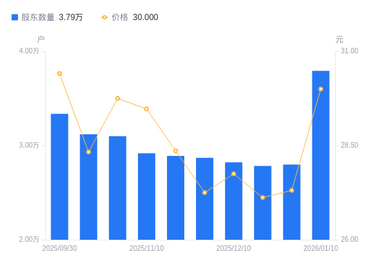 日期A股户数(户)流通A股户均持股数(股)户均持股市值(万元)2026-01-10379276198.2018.592025-12-31279778402.5922.952025-12-19278378444.8522.902025-12-10282108333.1923.122025-11-28286958192.3422.322025-11-20288998134.5123.072025-11-10291758057.5623.752025-10-31309857586.8722.572025-10-20311947536.0421.352025-09-30333677045.2621.42