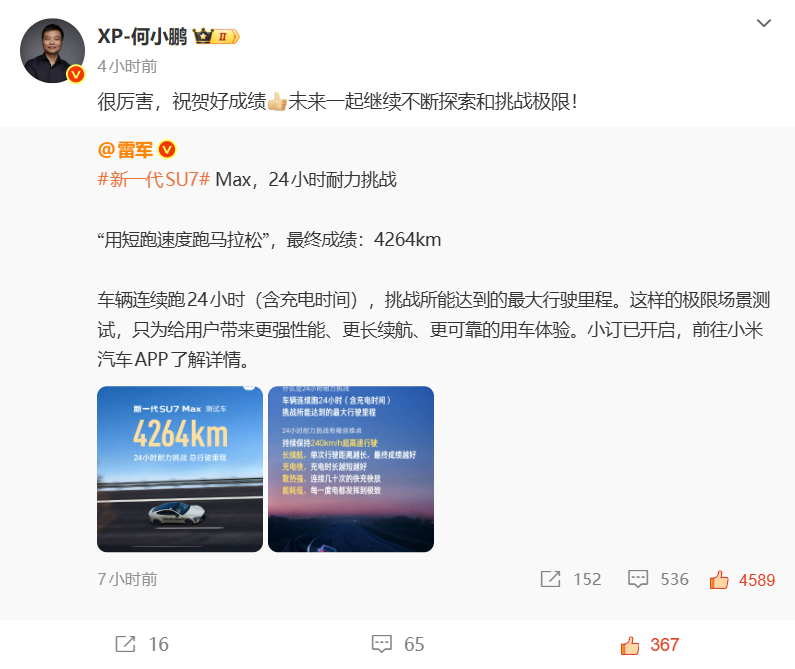何小鹏祝贺小米SU7耐力成绩 不出意外何总来祝贺了,格局这一块还得是何总。小米和