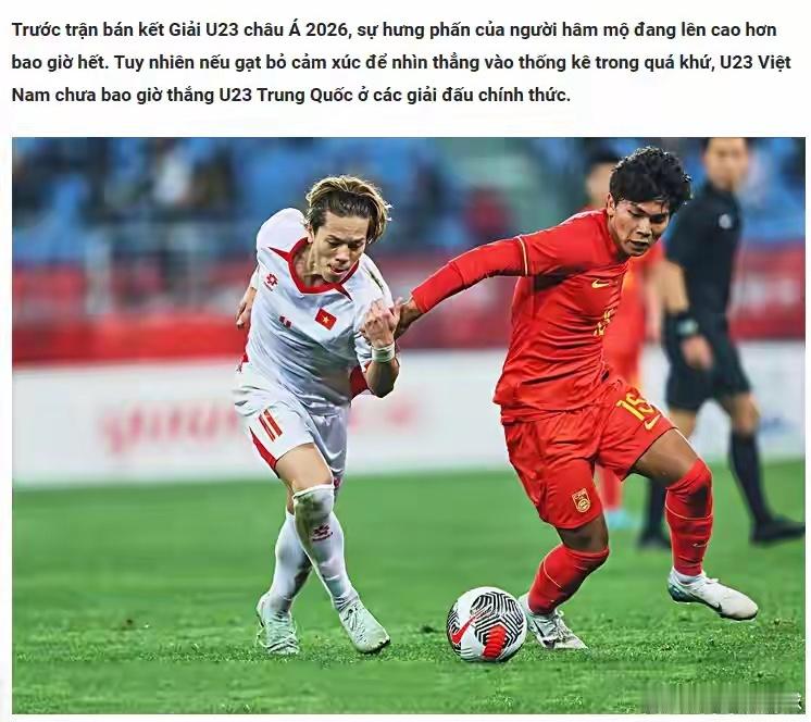 U23亚洲杯半决赛即将上演中越对决,越南媒体指出,越南U23在正式比赛中从未战胜过U23国足:2000年奥运预选赛、2002年和2010年亚运会,U23国足4次全胜且零失球。越媒坦言,中国队如今以死守战术著称,本届赛事至今零失球,这种沉稳的防守让越南队很难找到突破口。