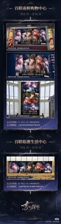 毋庸置疑,上海拥有全国最活跃、最成体系的二次元线下生态,“足不出沪”“一天到晚就知道上海”已经成了社交平台的流行梗。官方活动与粉丝“为爱发电”相辅相成,许多商场开启“痛楼”企划,到处可见动漫或游戏角色的宣传大屏、海报和人形立牌等。为庆祝游戏开服两周年,《恋与深空》自2025年12月31日起,在上海、北京、成都、广州共13座城市的商场投放大屏,上海投放数量高居第一,为8家。此次投放范围还覆盖至郊区,百联南桥购物中心、百联临港生活中心均有长达一个月的大屏播放。