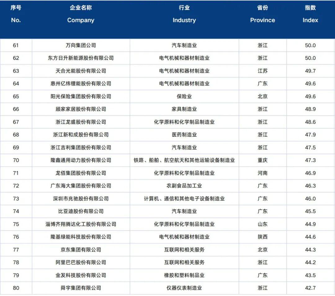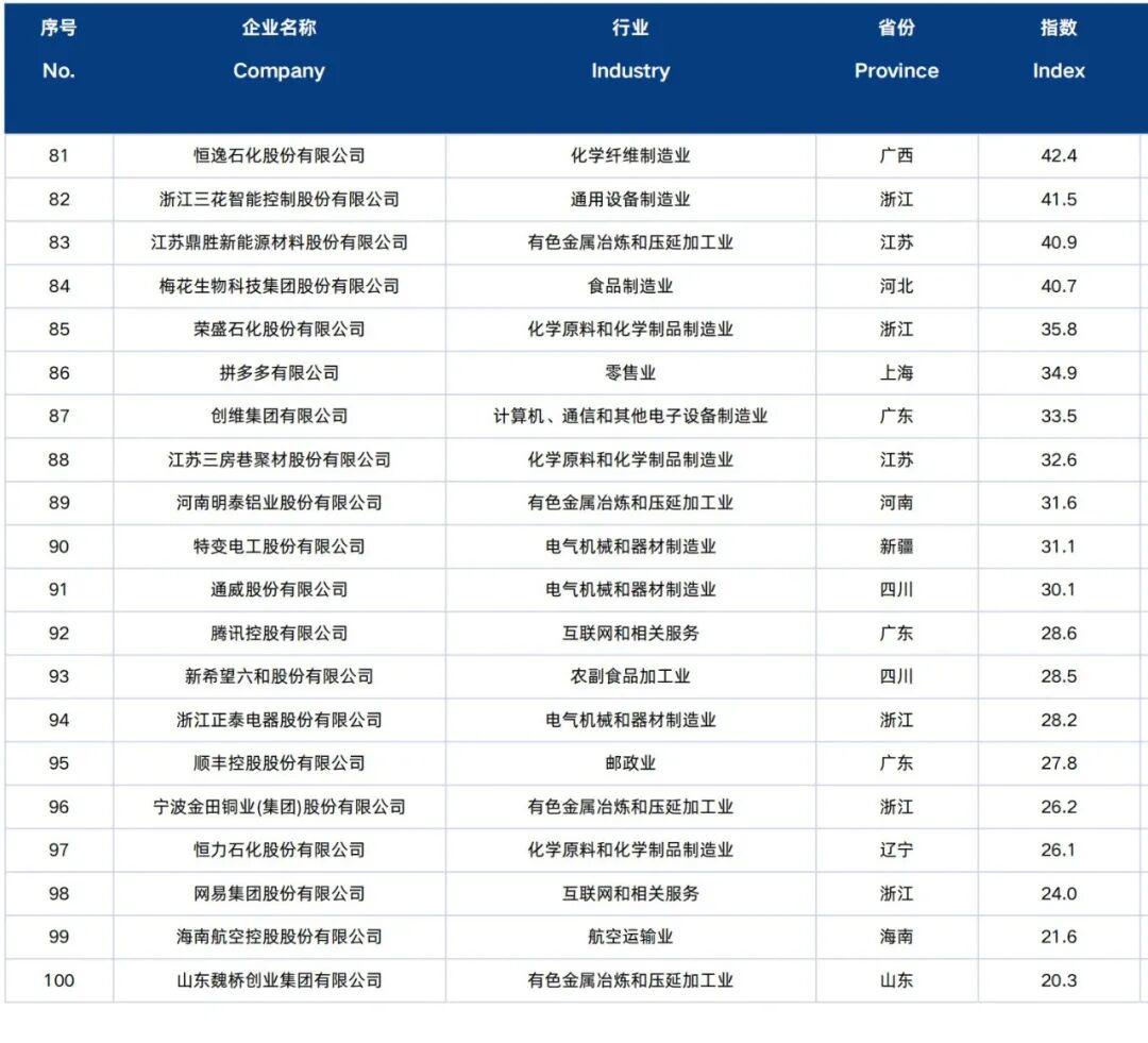 省市分布上,百强企业覆盖全国21个省、自治区和直辖市,浙粤苏鲁京沪领跑全国。其中浙江、广东各22家,江苏、山东各8家,北京、上海各6家。区域聚集特征显著,长三角地区上榜40家,珠三角22家,京津冀9家,长三角成为民营企业国际化的核心聚集区。