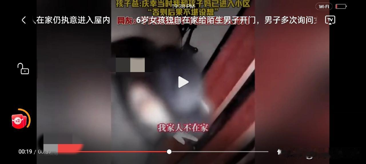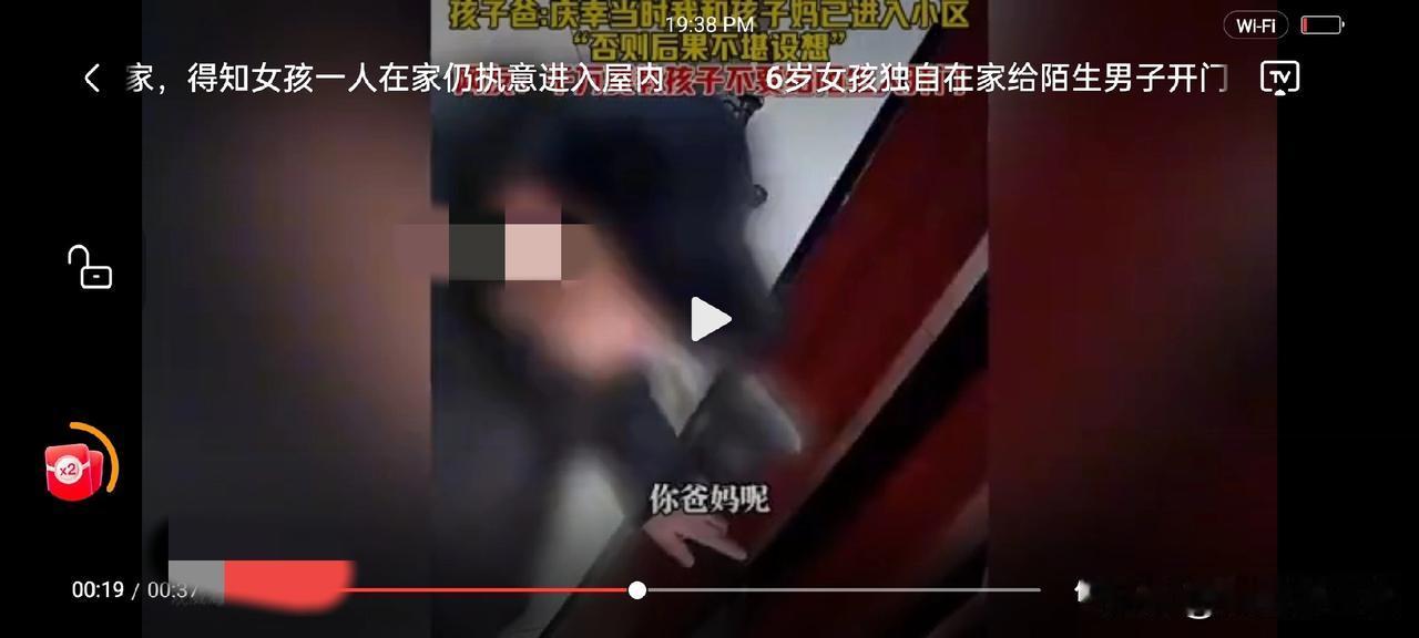 6岁小女孩一个人在家,听见陌生男人敲门,毫无防备就开了,陌生男子带着帽子,第一句话就是“你爸妈呢”,小女孩很清晰的说”我家人不在家”,但是男子还是进去关上门了,这种明知道家里没大人还硬要进去,绝对别有目的,得亏大人回来了,不然后果不堪设想。 小女孩开门还说了句“你好”,可见孩子挺聪明有礼貌,说话表达也挺利索。 但是,必须得启发教育孩子,大人不在家,不能轻易随便给陌生人开门。 即使是大人,也不能随意给陌生人开门!