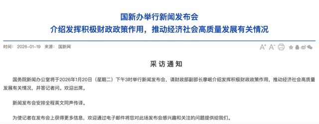 国务院新闻办公室将于2026年1月20日(星期二)下午3时举行新闻发布会,请财政部副部长廖岷介绍发挥积极财政政策作用,推动经济社会高质量发展有关情况,并答记者问。