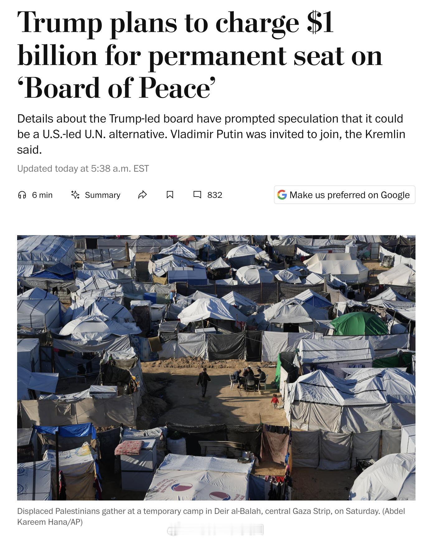 川普向多国领导人发邀请,邀请他们加入一个新成立的“和平委员会”,想要在委员会中获得一个永久席位,各国需要支付10亿美元。受邀的国家包括阿根廷、加拿大、埃及、法国、匈牙利、印度、意大利、哈萨克斯坦和土耳其等国。约旦外交部周日表示,约旦国王也在受邀之列。普京也已收到邀请。发言人Peskov说:“莫斯科正在研究这项提议的所有细节,并希望与华盛顿方面联系,进一步澄清相关问题。”埃及和土耳其方面确认收到了邀请,但两国都尚未表示是否会参加。热点现场海外新鲜事今日热点