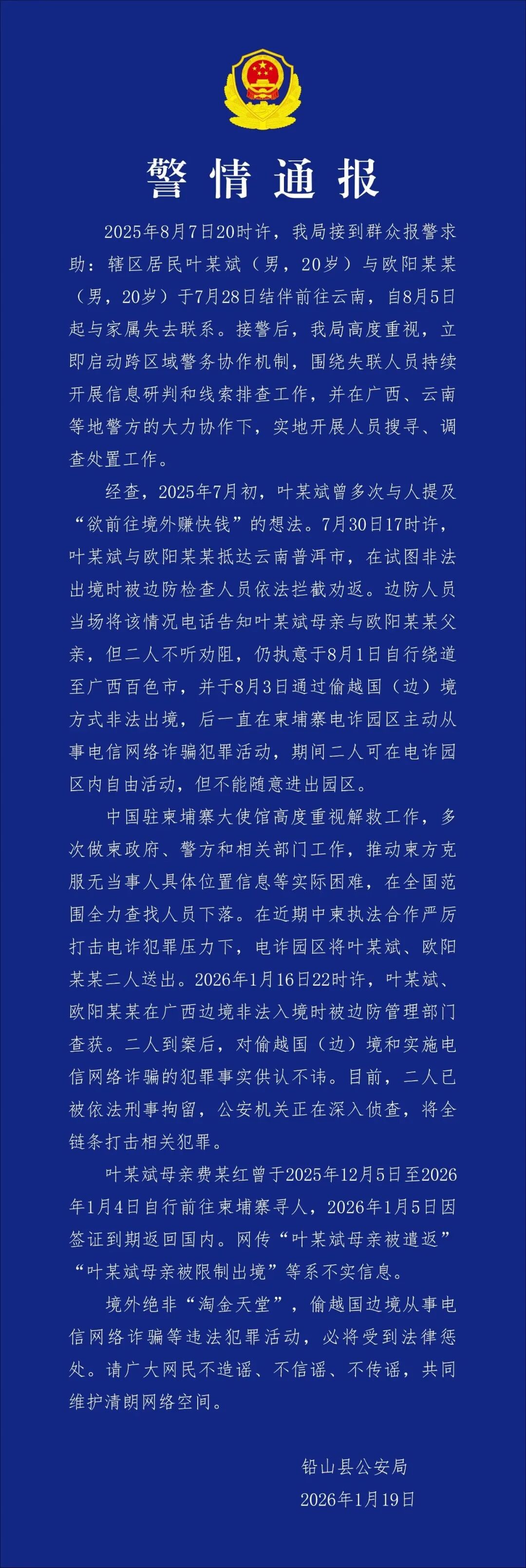 近期,男子叶文斌在柬埔寨失联、其母前往柬埔寨寻子,持续引发关注。1月19日,江西省上饶市铅山县公安局就此事发布警情通报。