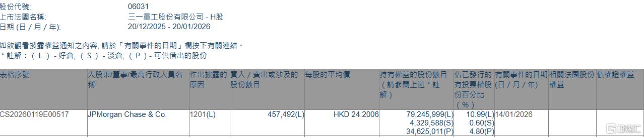 格隆汇1月20日丨根据联交所最新权益披露资料显示,2026年1月14日,三一重工(06031.HK)遭JPMorganChase&Co.以每股均价24.2006港元减持好仓45.75万股,涉资约1107.2万港元。