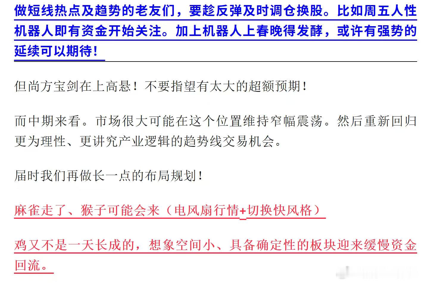 《多看少动吧——遏制趋严处,恰逢冬藏时》前情回顾昨天如期应验反弹,但量能有所萎缩。多数个股展开小幅修复!但力度都一般!如武僧昨天文章所讲!《麻雀走了、鸡也停下来、猴子果然来了》如图:村里的本意应该是:打上一枪,把麻雀吓跑,让鸡慢慢吃食,慢慢成长。结果是:枪一响,麻雀跑了,鸡也被吓了一跳,暂停吃食。最炸裂的是,惊醒树上原本睡觉的猴子!因此,猴市来了!早盘商业航天、AI应用、有色都有所反弹。但迅速切换了其他个股。受四大机器人上春晚影响,机器人走了一小时左右的行情。午盘冲高回落,加化工方向有所表现!如图:我呸!!!这行情还有啥搞头?不如休息休息,刷刷网站,备备年货!不过行情仍然有值得分析的地方!武僧以前多次提到过。就是化工股的机会!当时讲到贵金属、有色金属的涨价会向下传导。又两个传导方向。①是消费电子、仪器仪表、设备等方向②是化工方向因为很多的科技生态和制造业生态有色金属和化工是很难分开的。比如:PCB板既要用到铜箔、也要用到树脂和环氧树脂增强纤维材料。再比如:大家都知道的去年的锂电行情。六氟磷酸锂电解液即需要“锂”也需要“氟化氢”、“五氯化磷”等还有很多贵金属制造过程本身需要贵金属催化剂!武僧说过,这个是值得中期、重点关注的!行情没什么好说的。不如打打广告。大家如果对投资还有兴趣、有投资行为,关注一下武僧的公众号!没事多留言。多互动!另外,强调一下。昨天发布的数据不是很好。对经济前景还是有点担忧。尤其利空消费复苏!人口出生率新低!有统计称低至抗日战争时期的数量。GDP增速一样不及预期!休息休息吧!交易策略大的仓位今天被放出来!大概率要还给市场部分利润了。出来休息休息可能是性价比比较高的策略当然如果有其他好的机会,武僧会在第一时间分享给大家消息概要 1、在全国检察长会议上,最高人民检察院对充分运用法治力量服务高质量发展等方面作出部署。最高检提出,会同中国证监会深化资本市场法治建设,完善证券检察派驻工作机制,从严惩治财务造假、操纵市场等证券犯罪,维护资本市场安全。(有点指向性。小堆人成群!名字就容易让猜忌)2、1月19日15时48分,我国在海南商业航天发射场使用长征十二号运载火箭,成功将卫星互联网低轨19组卫星发射升空,卫星顺利进入预定轨道,发射任务获得圆满成功。3、美光科技公司表示,内存芯片短缺在过去一个季度愈演愈烈,并重申供应紧张状况将持续到今年之后,原因是人工智能基础设施建设对高端半导体的需求激增。当前看到的短缺程度的确前所未见。4、“大空头”迈克尔·伯里再次对人工智能泡沫发出警告称,展望未来,他预测科技行业的就业人数将下降,或者不会大幅上升,因为该行业或将面临一个非常漫长的低迷期。5、广期所发布通知,经研究决定,自2026年1月21日结算时起,碳酸锂期货合约涨跌停板幅度调整为11%,投机交易保证金标准调整为13%,套期保值交易保证金标准调整为12%。6、巴西圣保罗大学日前宣布为该校研发的一款铌电池申请专利,该电池电压可达3伏特,具备充放电能力,目前已进入工业测试阶段。7、南京市政府官网日前发布《南京市网络预约出租汽车管理办法》。针对网约车平台“抽成不透明”等,《办法》规定平台应公开抽成比例上限。驾驶员方面,删除“本市户籍或居住证”条款。