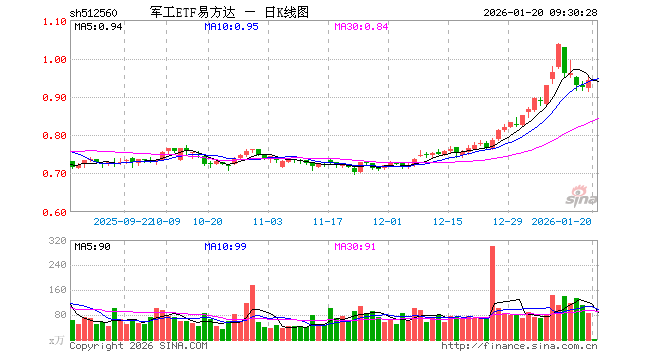 1月20日,军工ETF易方达(512560)开盘涨0.21%,报0.945元。军工ETF易方达(512560)重仓股方面,中国船舶开盘跌0.14%,中航沈飞跌1.06%,光启技术涨0.25%,航发动力涨3.02%,中航光电跌0.69%,中航西飞跌0.56%,中国长城涨2.28%,睿创微纳涨0.77%,菲利华跌0.06%,航天电子涨1.81%。